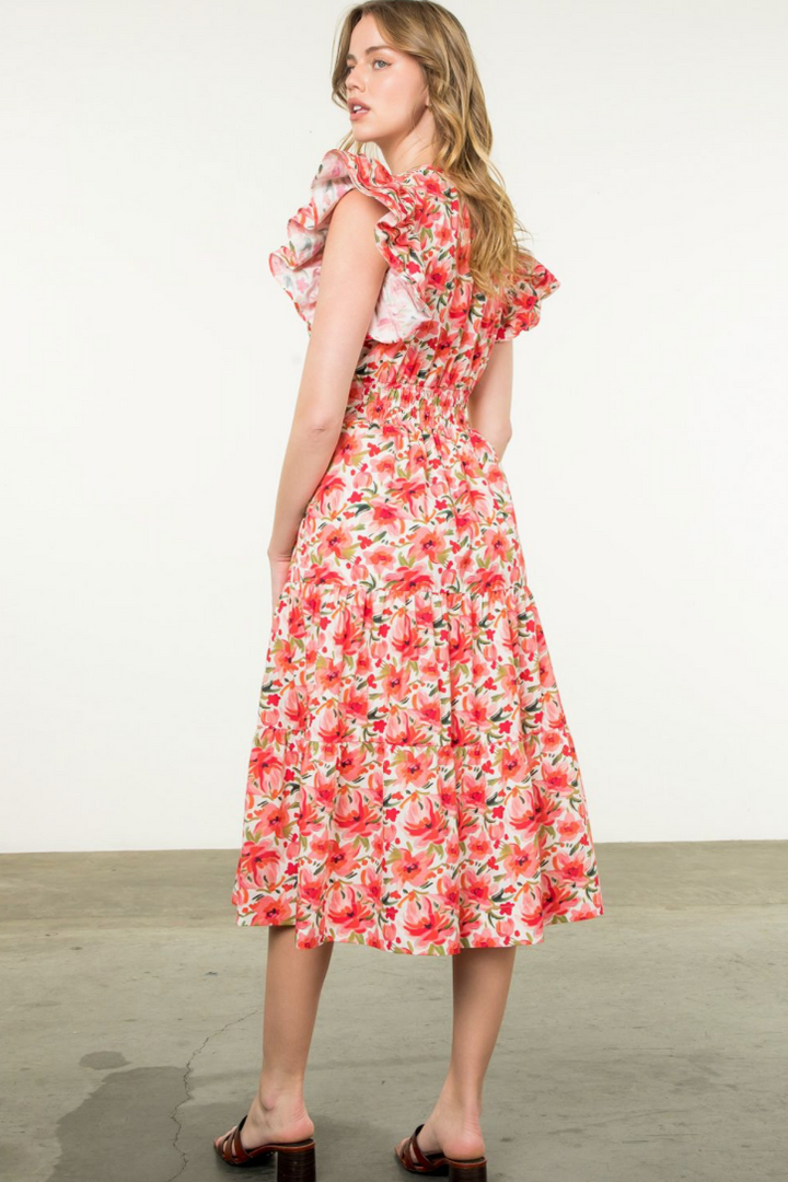 Ruffle Sleeve Floral Midi Dress—Red/Cream