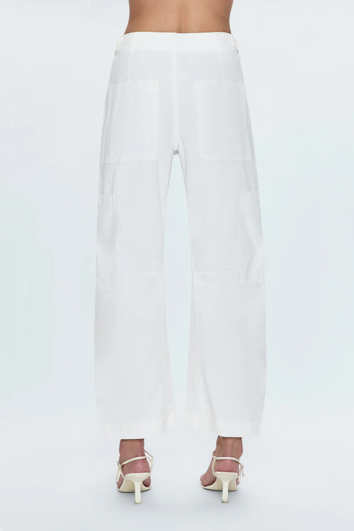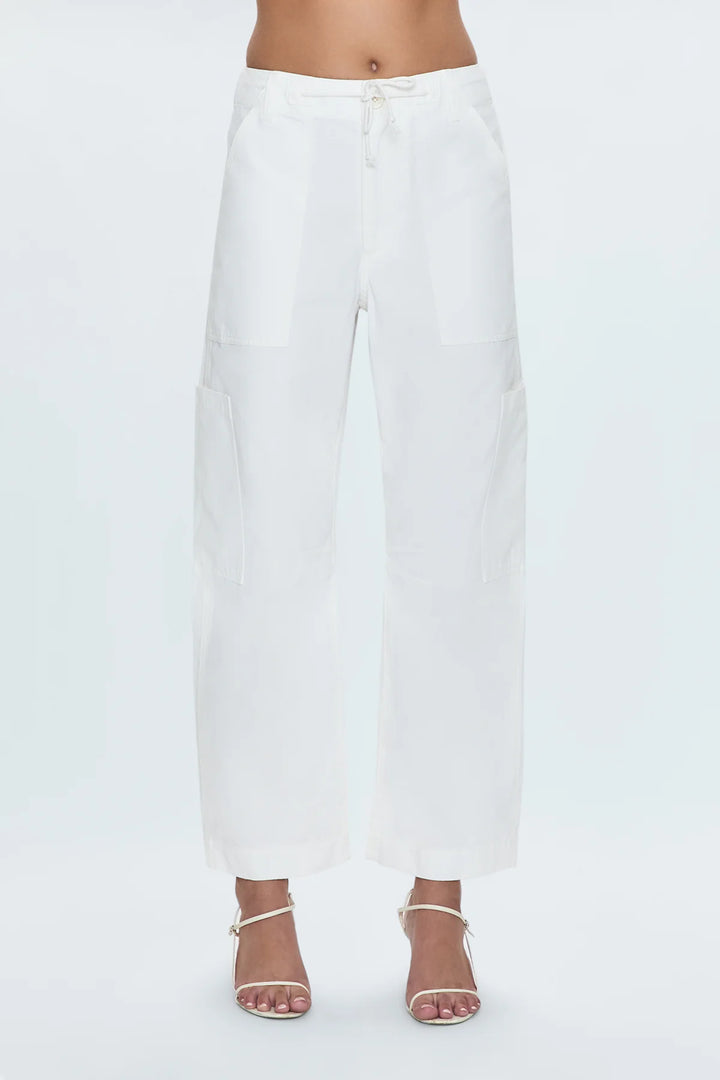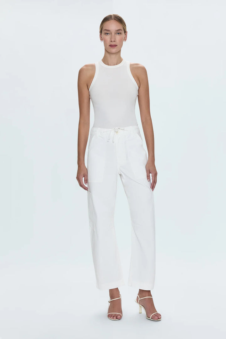 Unleash your inner fashion guru with the Sabrina Curved Utility Pants in White. Made from durable non-stretch twill, these pants offer a structured fit that stays in shape all day long. The hidden waistband tie and utility pockets add a touch of customization and functionality. Elevate your off-duty style with these modern and unique pants.