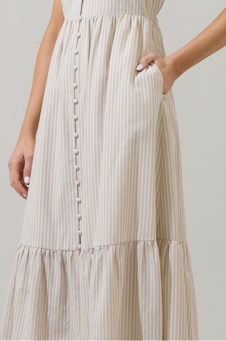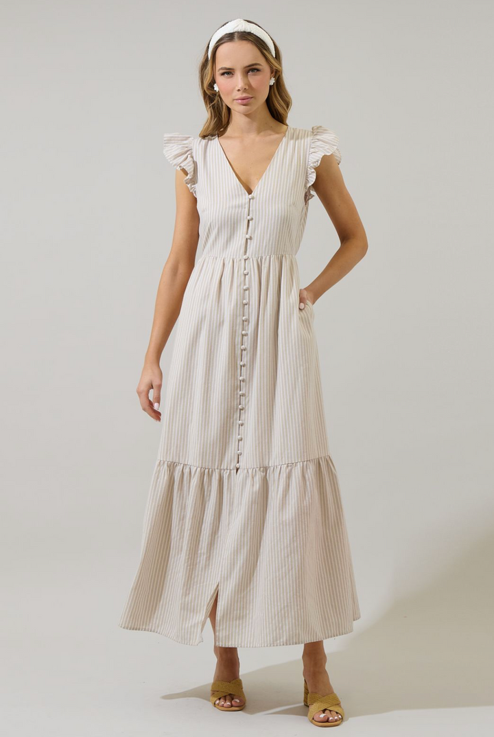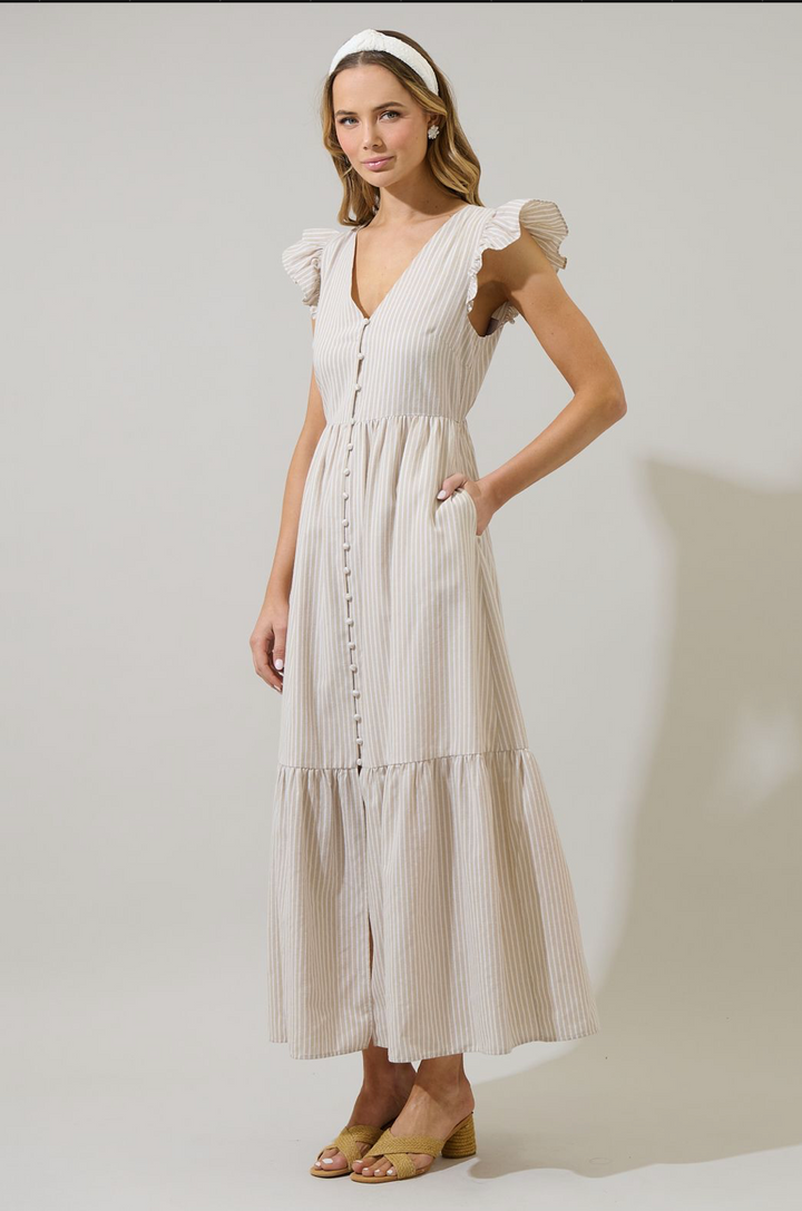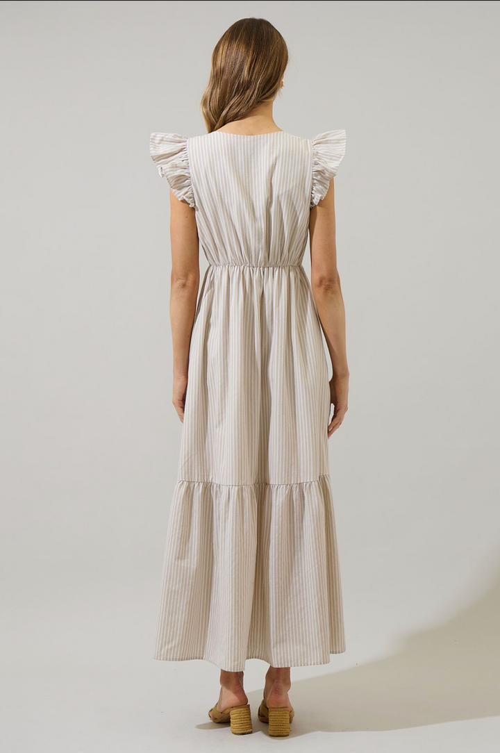 Sandy Striped Evianna Flutter Maxi Dress- Tan/White