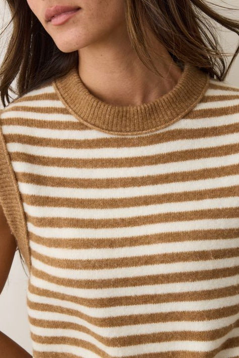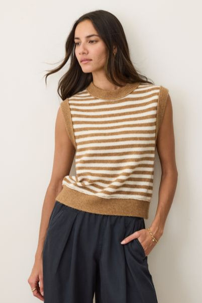 Embrace versatility with the Sausalito Sweater Vest in Nutmeg Stripe. Crafted from luxuriously soft, fuzzy jersey stitch featuring extrafine Merino wool, this lightweight vest is perfect to wear alone as a chic top or layered up when the season cools down. Thoughtfully designed to be your favorite go-to piece for that ever-tricky transitional weather.