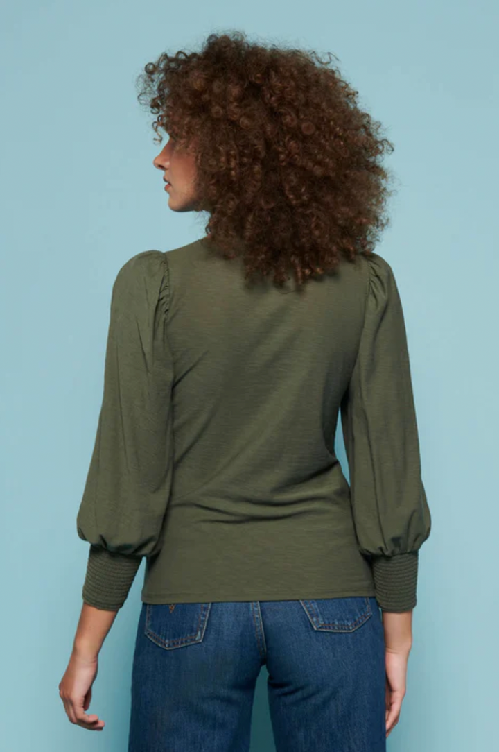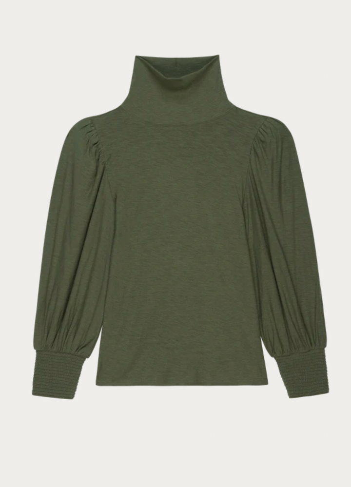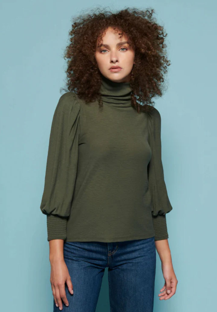 This statement Sawyer Femme Turtleneck is the perfect way to update your everyday wardrobe. Shoulder pads and dramatic balloon sleeves with smocked cuffs provide an eye-catching look, while the olive green hue creates a moody and stylish vibe. Step out in confidence and style with this extraordinary turtleneck!