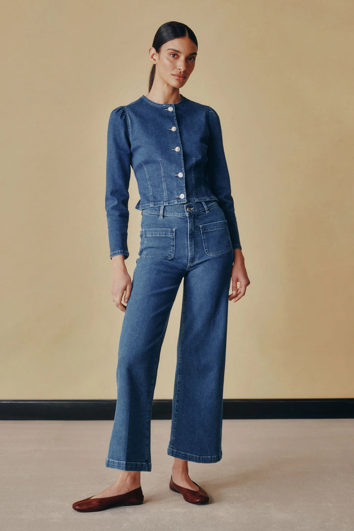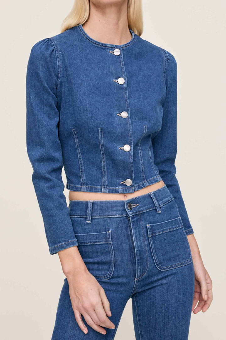 This playful denim long sleeve top brings fresh energy with its bright Blue Water rinse. Featuring a button-front and clever internal darts, it sculpts your shape while keeping things fun and effortless. Silver hardware and tonal stitching add subtle shine and polish to your everyday look.