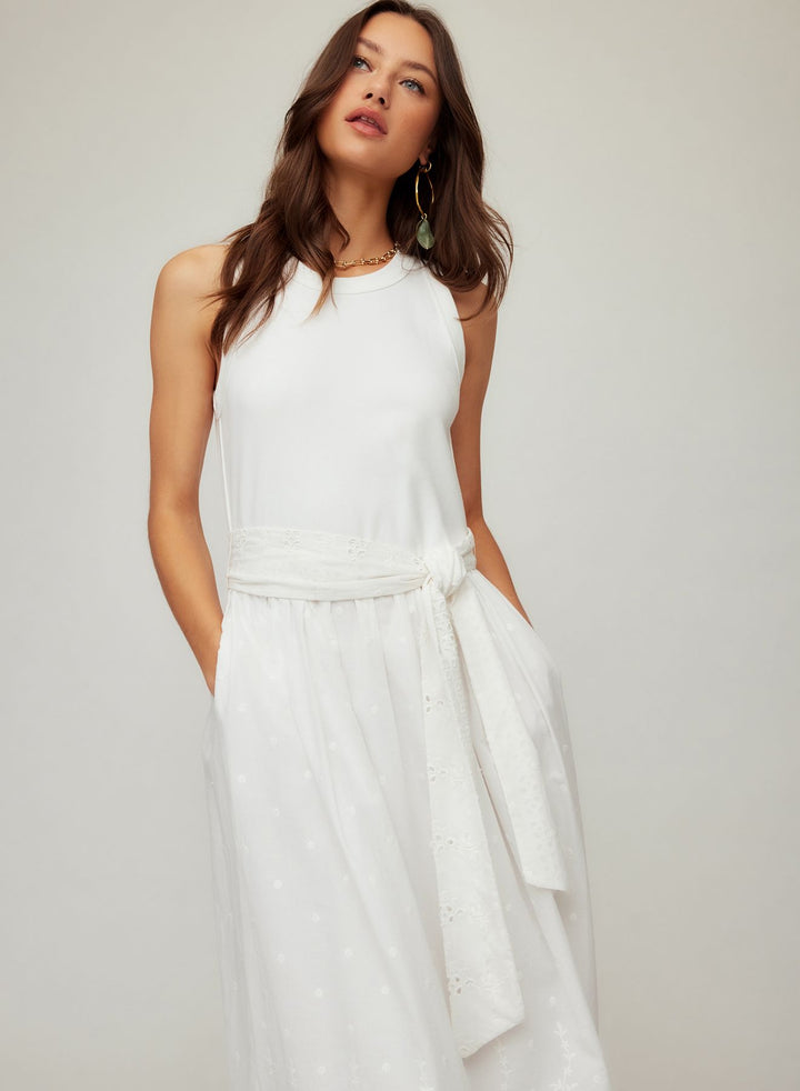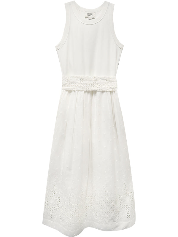 The Seline Contrast Midi Dress merges refined construction with versatile seasonality. Its cotton-modal rib-knit tank bodice provides structure and breathability, while the embroidered skirt introduces textural depth and visual interest. The wide self-tie sash cinches the waist with precision, creating definition without constraint. Cut to midi length, this mixed-media piece transitions seamlessly from daytime wear to evening occasions, making it a considered investment for warm-weather wardrobes that demand both sophistication and practicality.