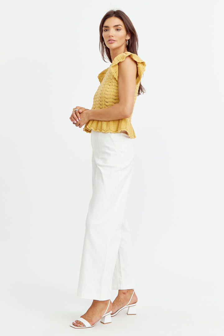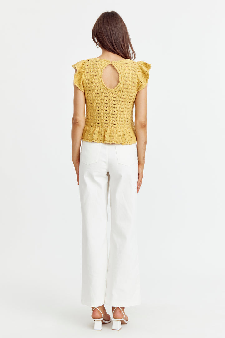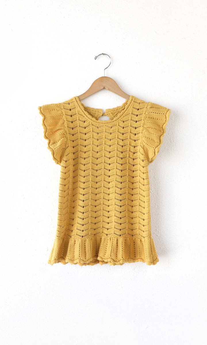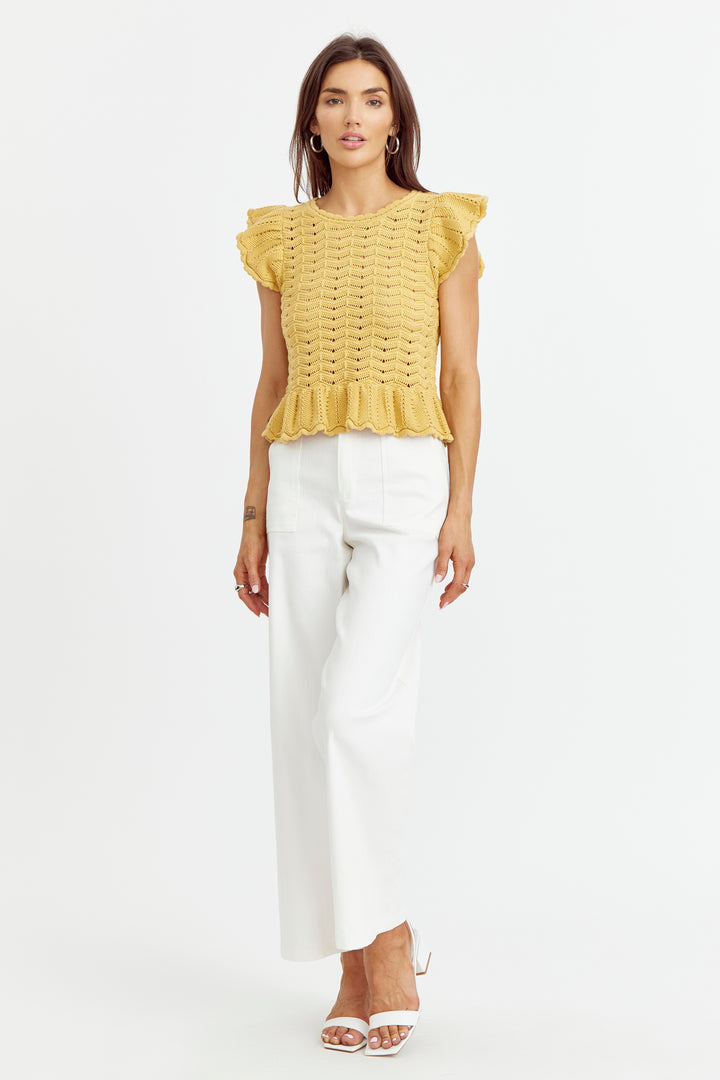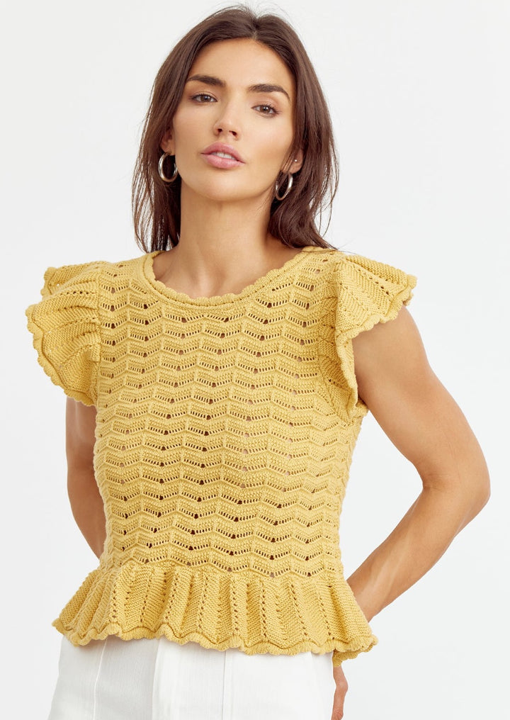 Elevate your wardrobe with our Sensi Knit Ruffle Sleeve Top in a stunning sunflower yellow hue. The beautiful sweater knit, scallop neckline, and flutter sleeves add a touch of elegance, while the peplum hem creates a flattering silhouette. Versatile enough to take you from work to date night, and everything in between!
