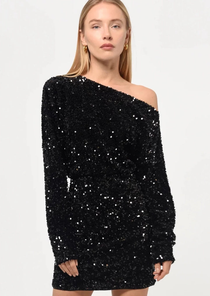 Elevate your style with our stunning Sequin Boatneck Mini Dress in black! The dazzling black sequins add a touch of glamour, while the off the shoulder design and 3/4 sleeves make it a chic and versatile choice for any party. Get ready to turn heads in this must-have mini dress!