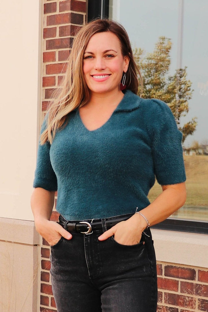 The softest, prettiest sweater you'll ever put on. Elevate your sweater game with the v-neck, collared, short-sleeve sweater from Melissa Nepton. This high-quality sweater will be a go-to for all your holiday events this season. Pair with your favorite pair of denim or vegan leather skirt. Fits true to size.