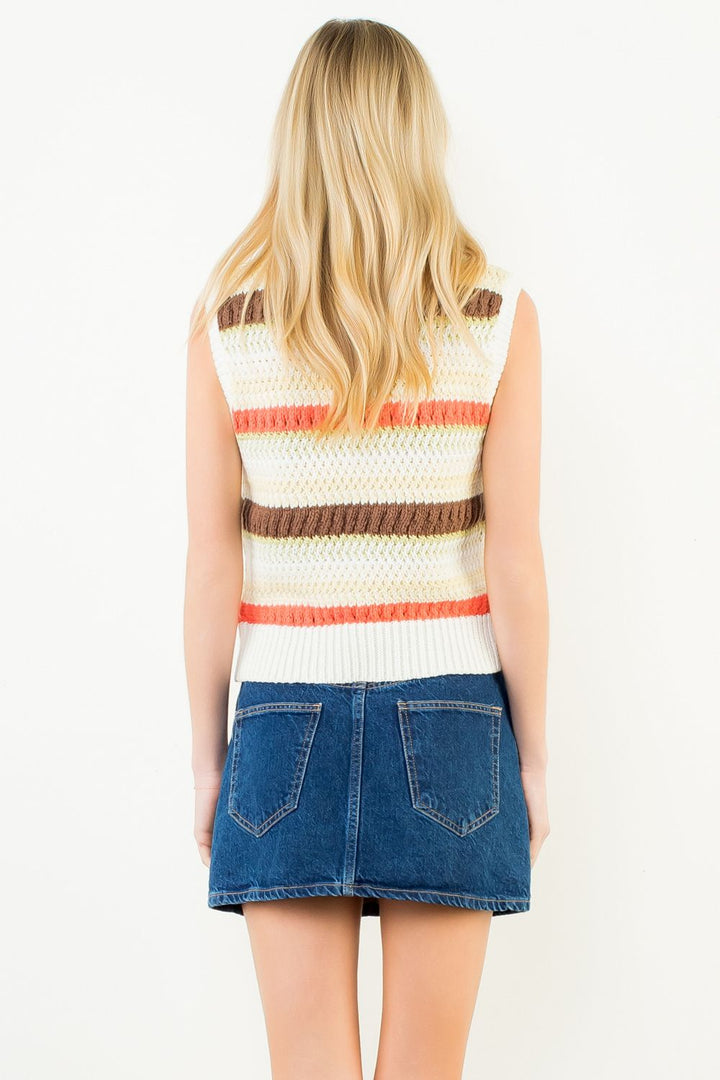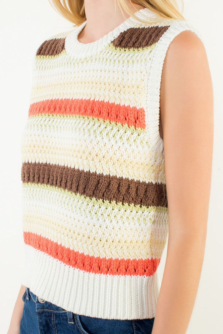 Effortless layering meets timeless style with this sleeveless sweater tank in soft cream. The subtle striped texture adds visual interest while the muted autumn palette works seamlessly with any wardrobe. Lightweight enough to wear solo on mild days or perfect as a versatile layer under jackets and shirts. A modern essential for transitional dressing.