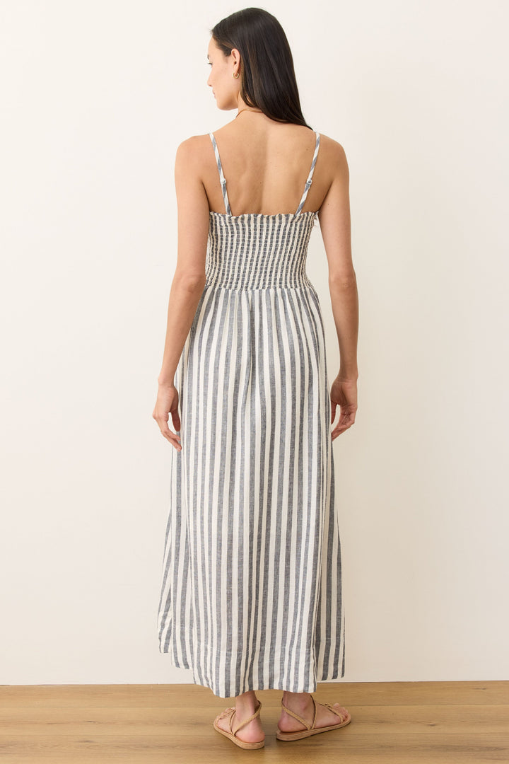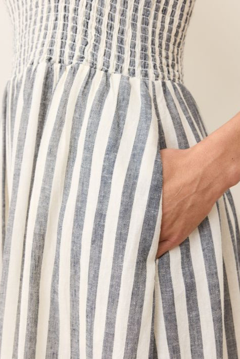 The Smocked Strapless Dress in India Ink Stripe combines sophisticated design with practical versatility. The expertly crafted smocked bodice ensures an impeccable fit while our proprietary sustainable linen blend offers durability that improves with wear. Removable straps provide styling flexibility, making this essential summer piece adaptable to various occasions. The distinctive India Ink Stripe pattern elevates this wardrobe staple from casual to refined.