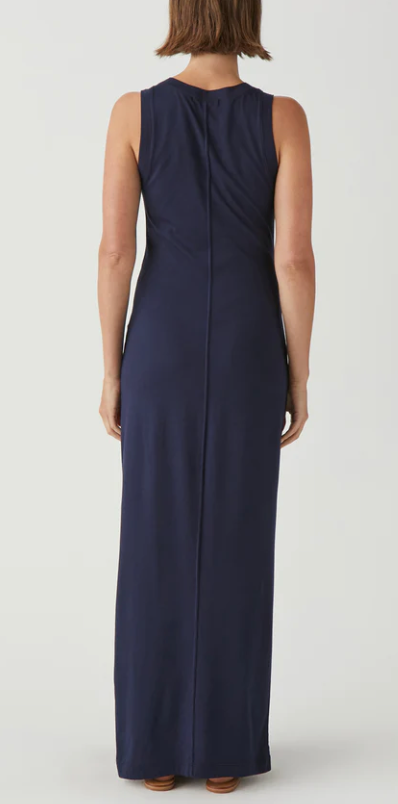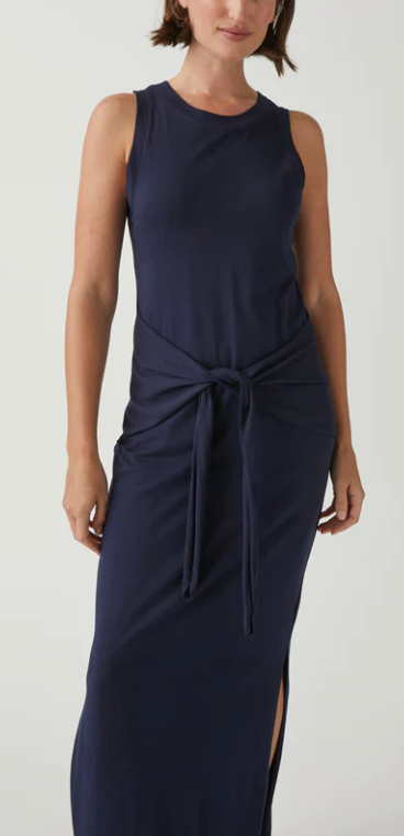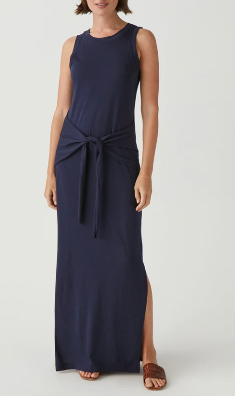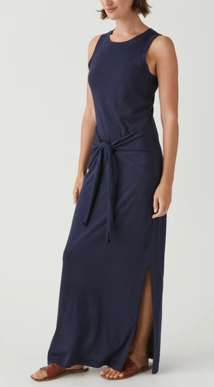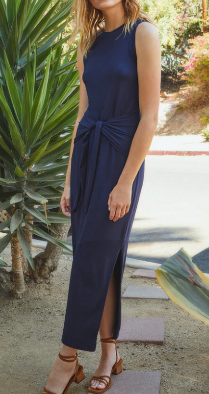 Add this beautiful cotton maxi dress in navy to your capsule wardrobe. A figure flattering column style dress featuring a side slit and adjustable tie at the waist that can be worn in the front or back. Made of lightweight cotton with just the right amount of stretch. Wear alone or throw on a denim jacket for cooler nights. 54" Length