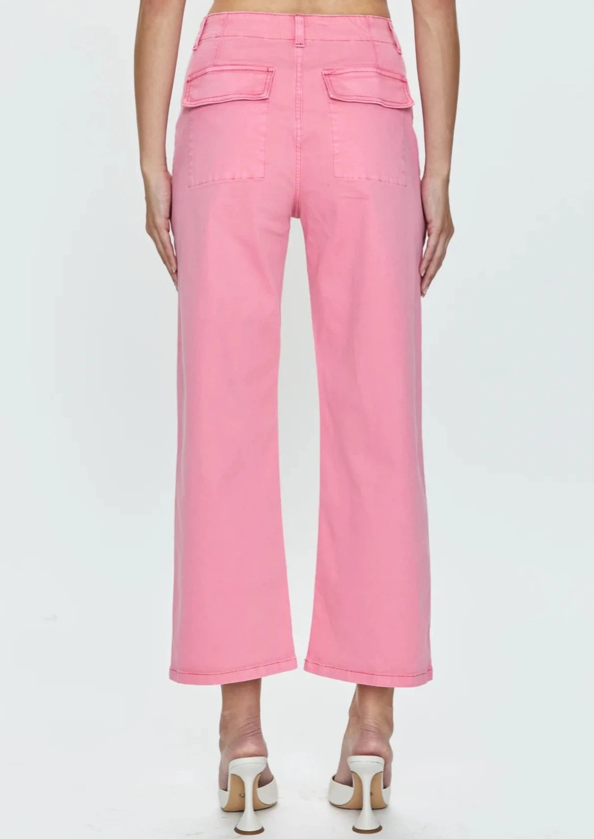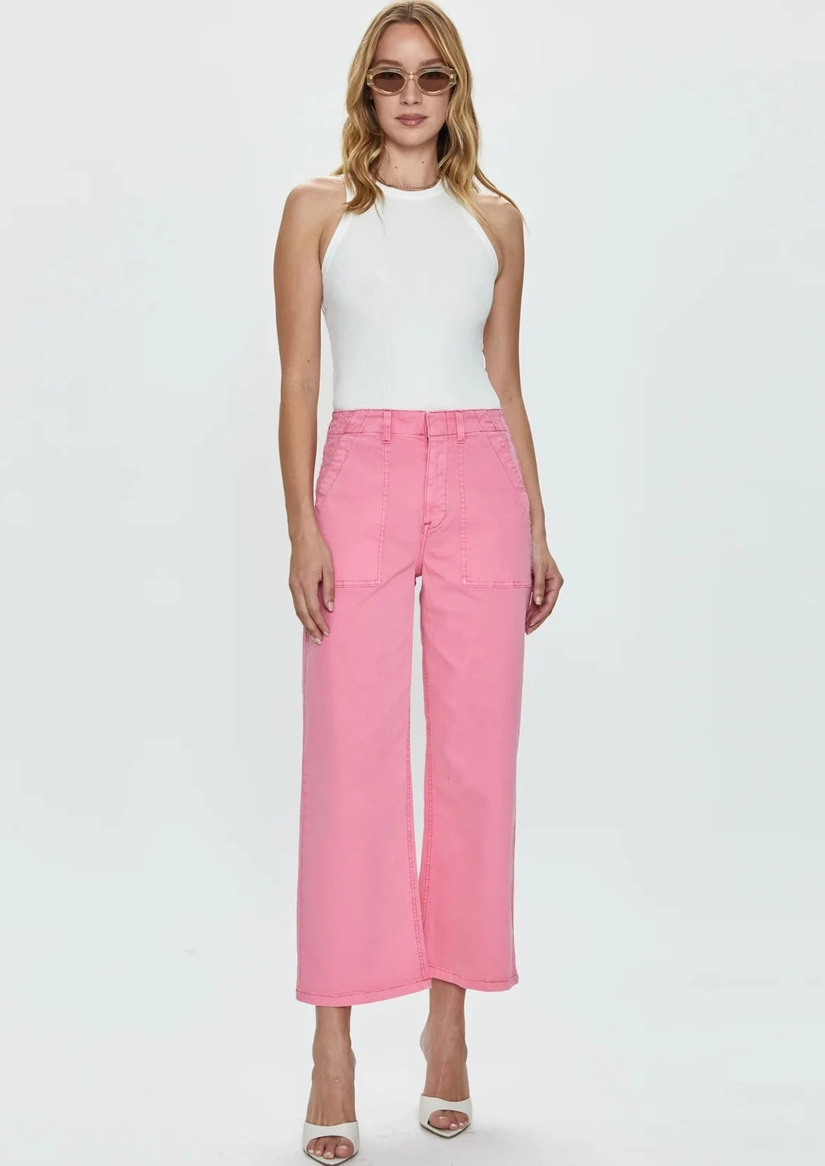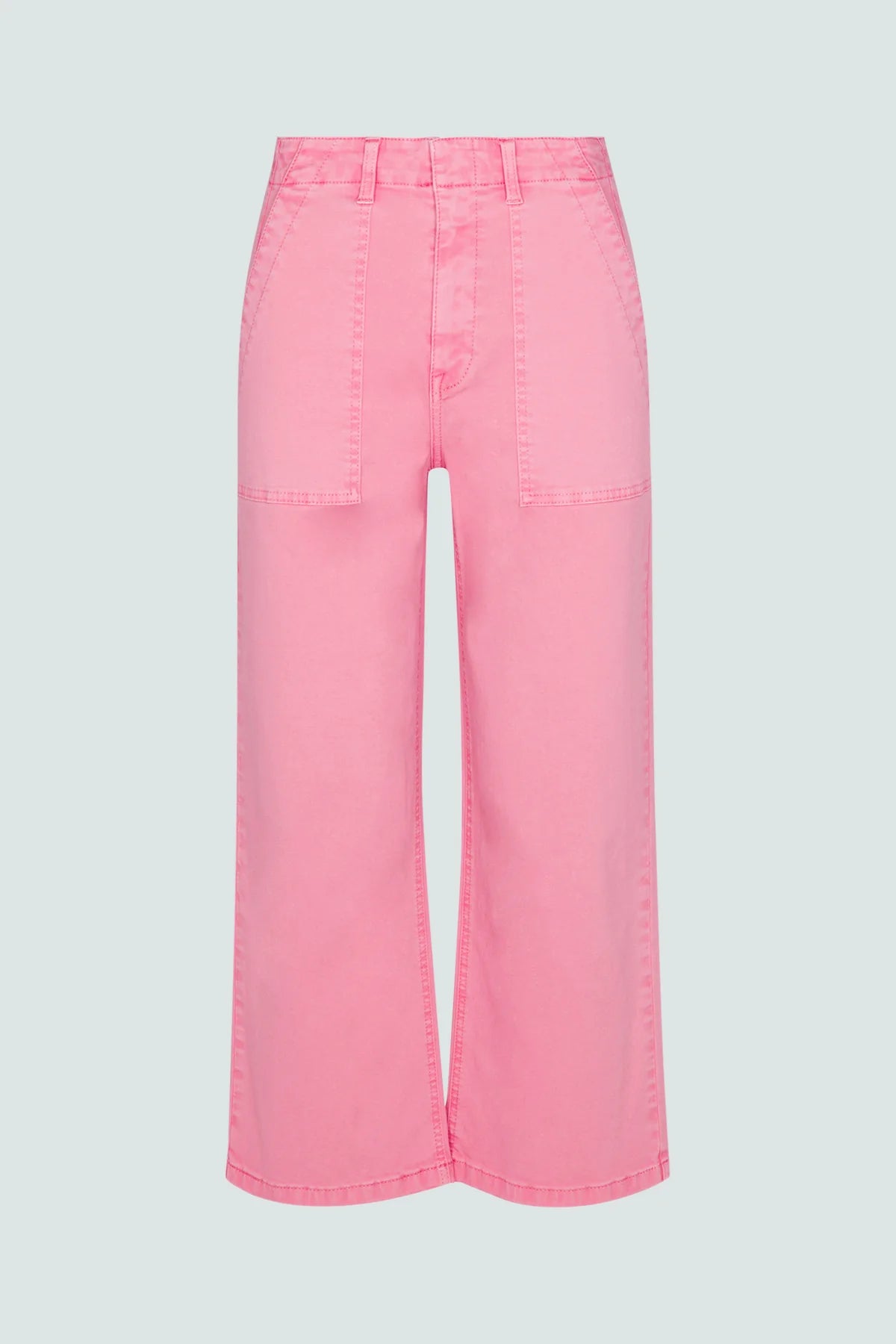 Sharpest tool in the shed. Relaxed, wide leg silhouette with a cropped, ankle length hem. Patch front pockets with seaming and button flap back pockets nod to utility design inspiration. Sophia is crafted from a comfort-driven trouser fabrication with stretch. 26" inseam