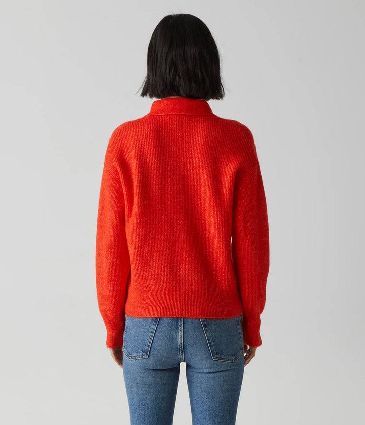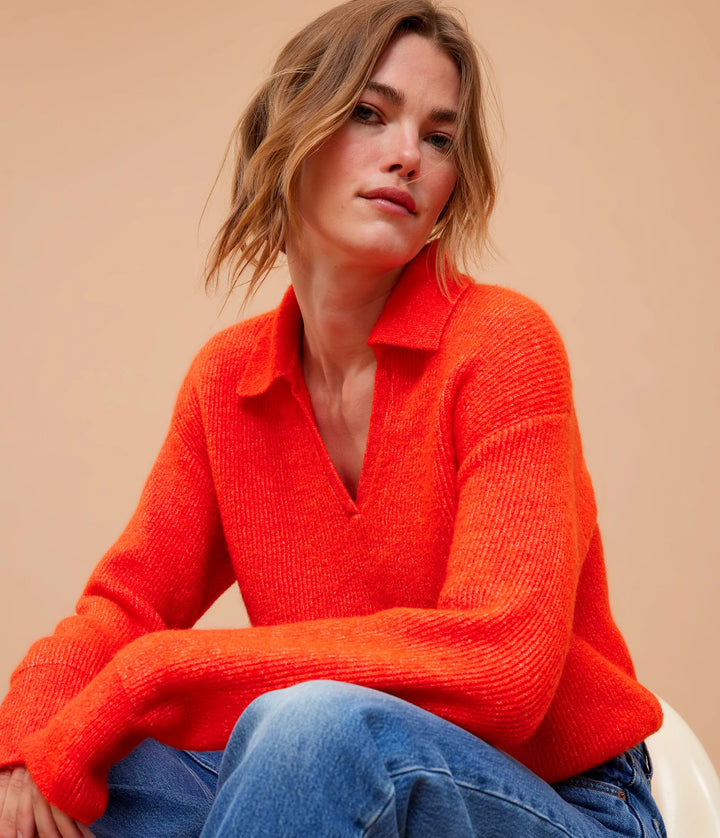 Add a splash of color to your wardrobe with the Stevie Collard Pullover in Tangerine! With its open collared v-neck, slightly relaxed fit, and hip length, this cozy sweater is the perfect addition for any outfit. Its bright orange hue adds a warm, inviting touch that will leave you feeling inspired. Ready to make a bold statement? Get the Stevie Collard Pullover now!