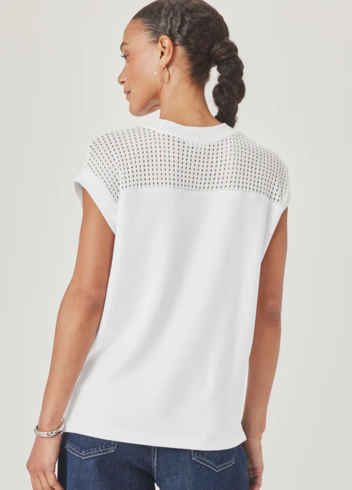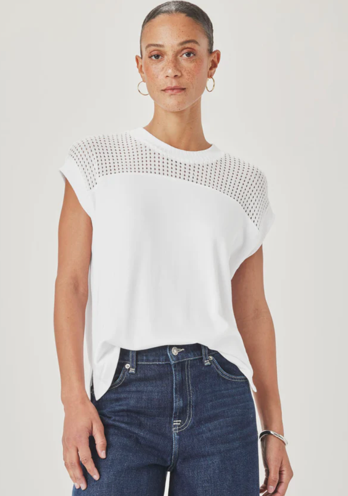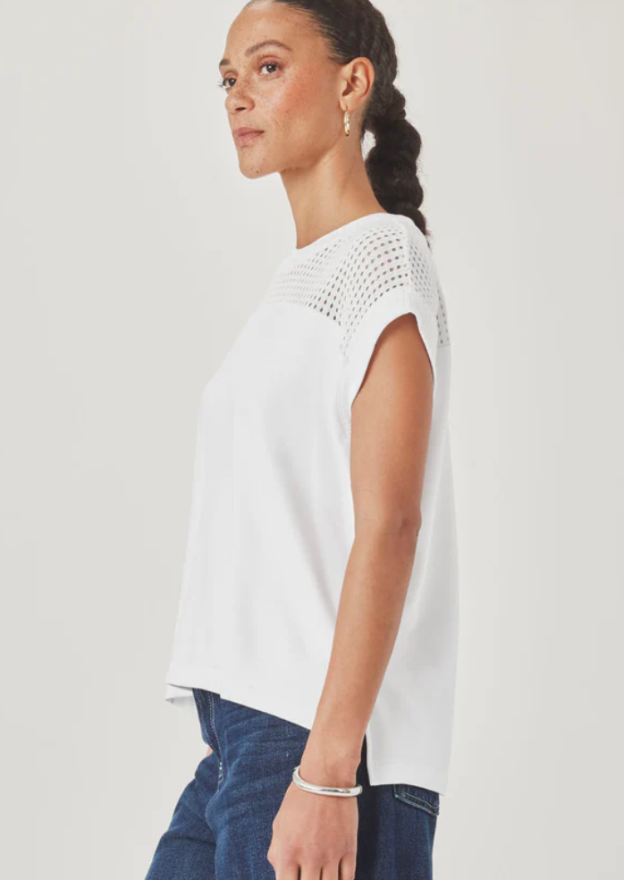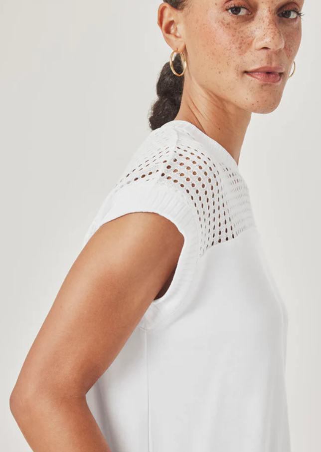 Effortless elegance meets everyday comfort in this sleeveless essential. Crafted with a soft, breathable fabric and finished with delicate pointelle lace detailing, the Jada top features a classic crew neckline and relaxed silhouette that works seamlessly from casual weekends to layered styling. A versatile wardrobe staple that pairs beautifully with denim or tailored pieces.
