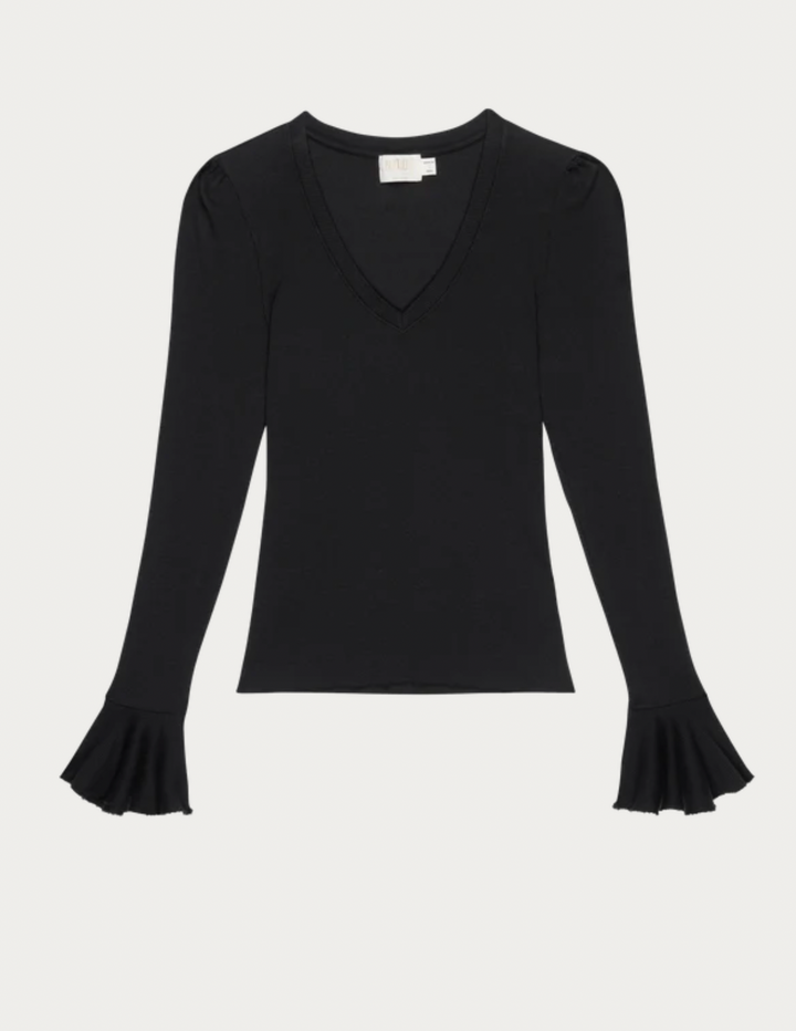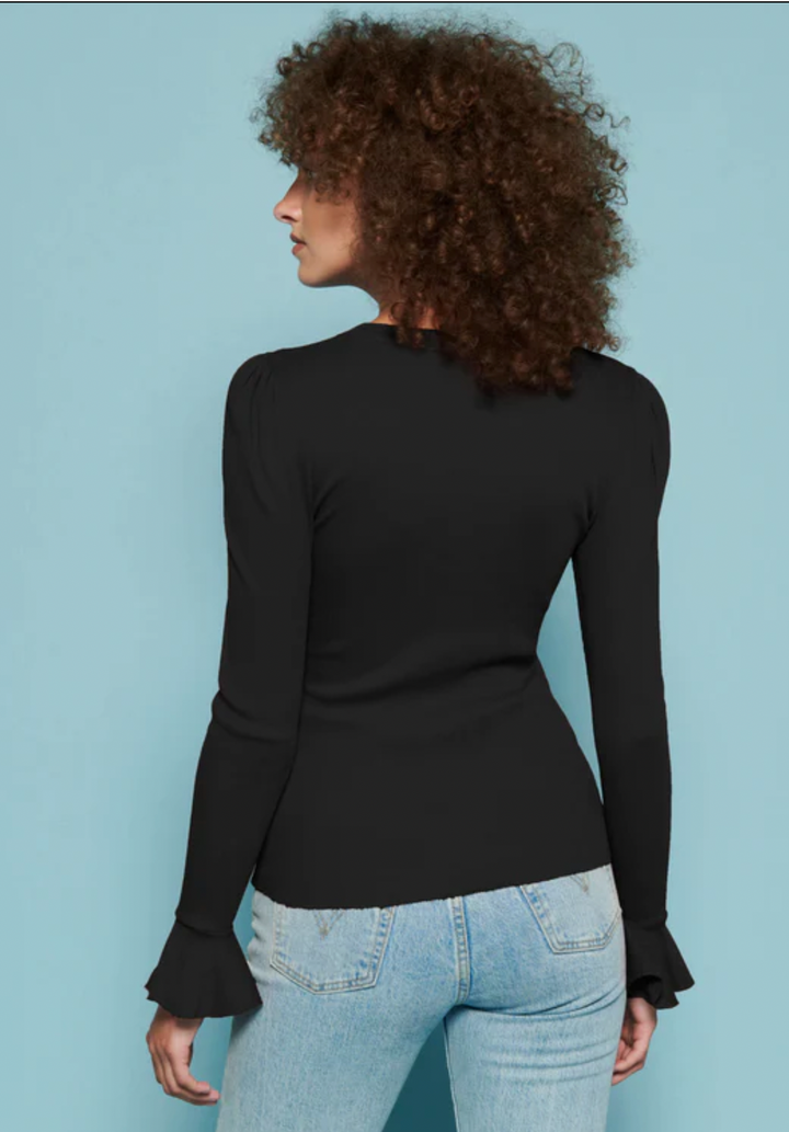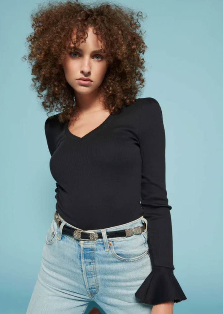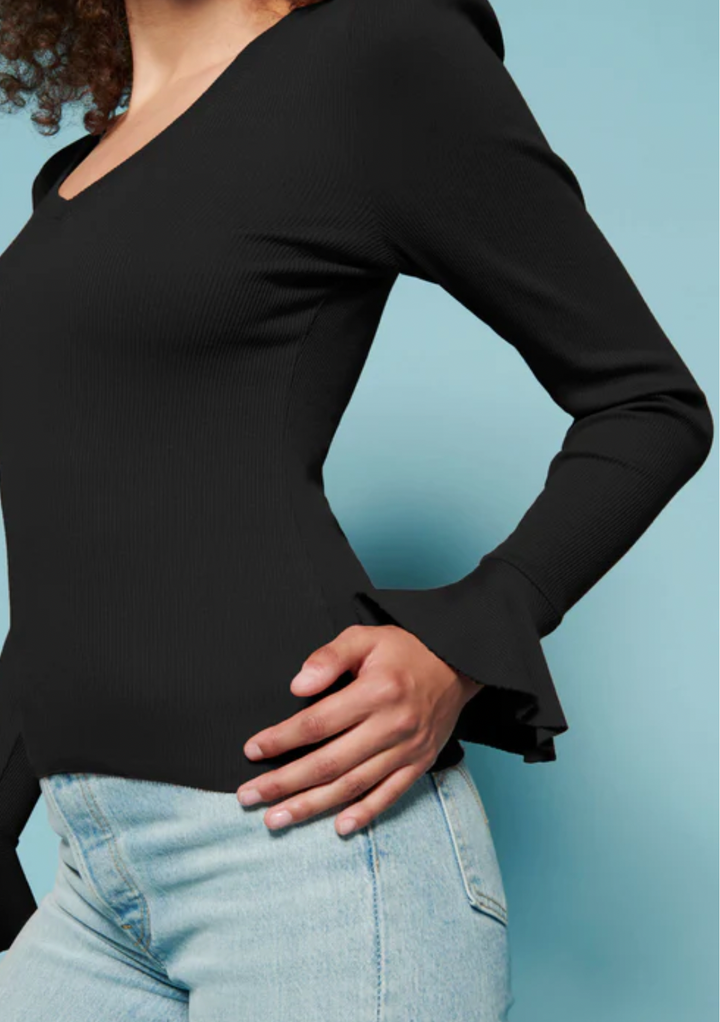 Elevate your everyday wear with the Sylvia Prim+Proper Tee! This jet black v-neck features a fine rib fabric with just the right amount of stretch, perfect for day-to-night styling. Ruffle cuff sleeves add a feminine touch for a modern, classy look! Transform your wardrobe with this amazing tee!