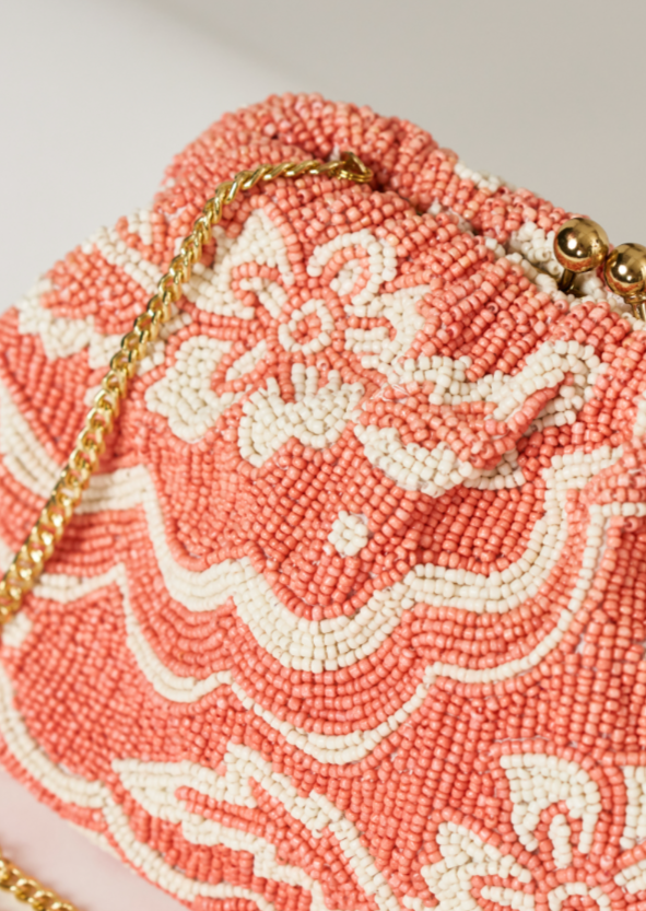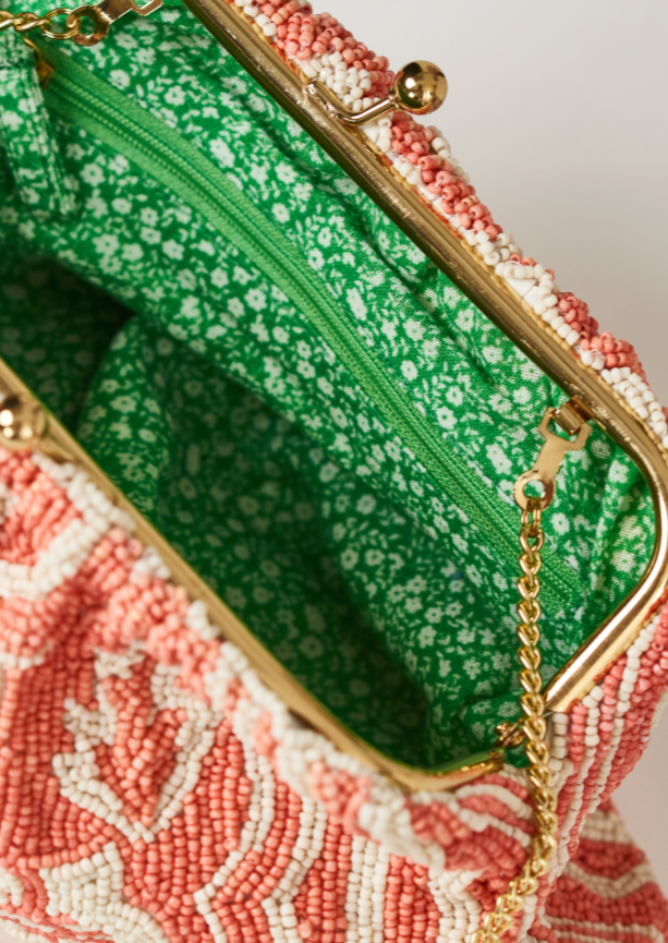 Get ready to turn heads with the Sylvie Bead Clutch in Coral Pink. Hand beaded and sewn, this beautiful clutch features a mix of coral and cream colored beads that add a touch of elegance and charm. The bright floral green lining with inner pocket adds functionality while the gold hardware and chain make it perfect for special occasions and a night out.
