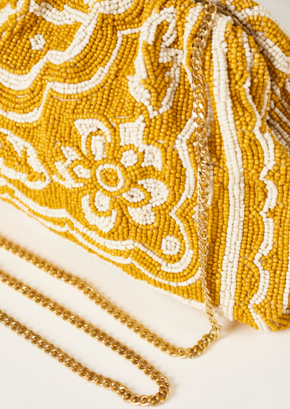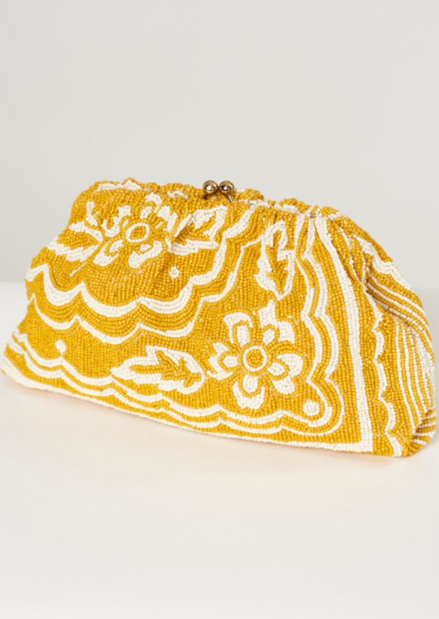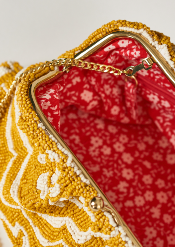 Get ready to turn heads with the Sylvie Bead Clutch in Mustard Yellow. Hand beaded and sewn, this beautiful clutch features a mix of warm yellow and cream colored beads that add a touch of elegance and charm. The bright floral red lining with inner pocket adds functionality while the gold hardware and chain make it perfect for special occasions and a night out.