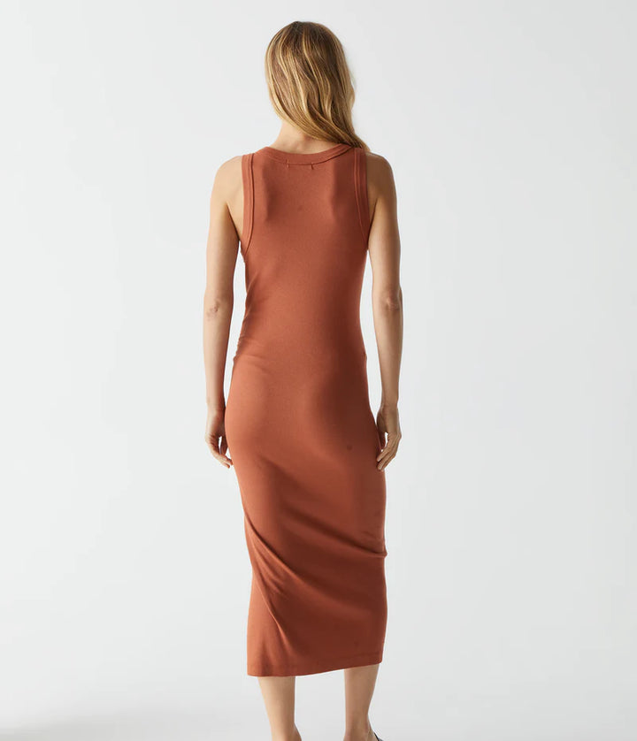 Expertly crafted with comfort and style in mind, the Tala Sleeveless Shirred Seam Midi Dress in a beautiful soft copper tan hue is the perfect day to night outfit. Its figure-flattering design and asymmetrical shirred seam highlight your silhouette, while the ultra rib fabric provides a comfortable stretch. Perfect for any occasion.
