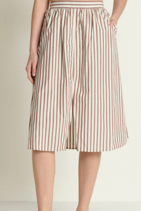 Bring vintage vibes to your wardrobe with the Tatiana Skirt in Sable Stripe. Crafted from 100% cotton poplin, this high-waisted skirt offers comfort with its elastic waistband, handy pockets, and a flirty slit. Wear it solo for effortless style or pair it with the matching Mimmi Keyhole Top for a playful, coordinated look.