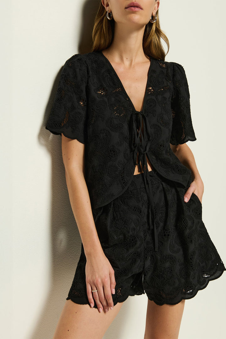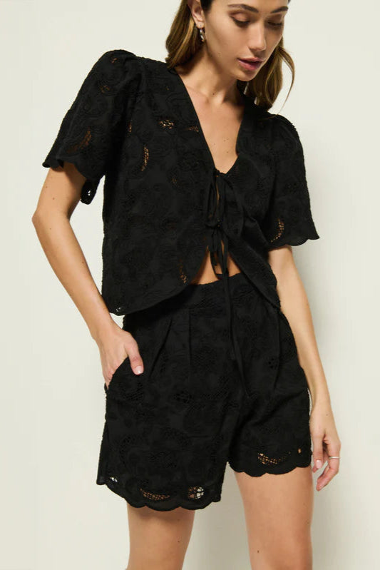 The Archer Short in Black offers a refined take on warm-weather essentials. Crafted with a lined lace mid-rise design, it combines comfort and elegance. Features include front hand pockets, an elastic waistband for a flexible fit, scalloped hems, and subtle pleated detailing, delivering a relaxed yet polished silhouette ideal for versatile styling.