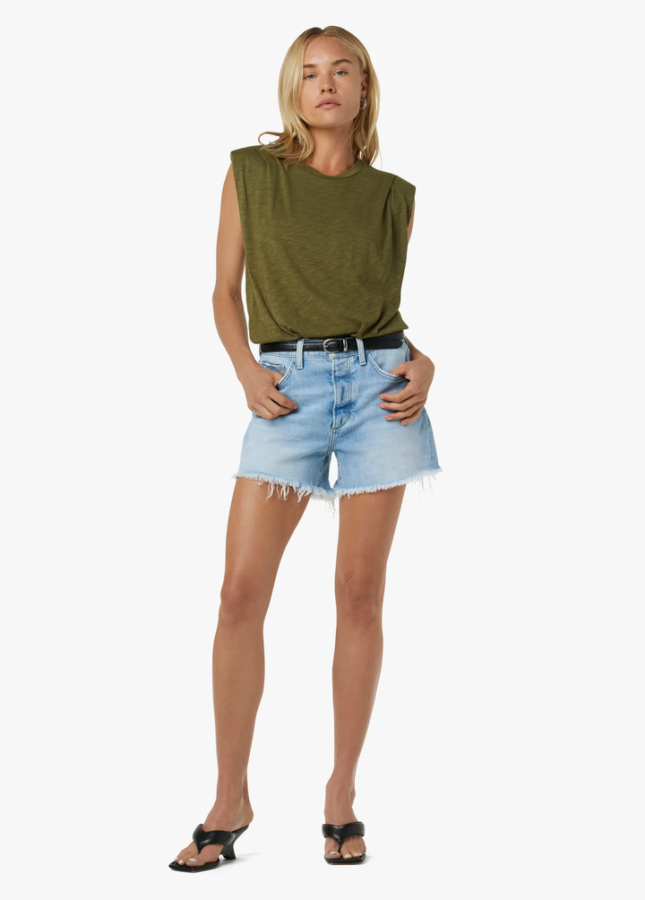 The Arden Sleeveless Tee- Burnt Olive: Your new elevated basic tee that will add a playful touch to your wardrobe. With a bubble hemline and muscle tee cap sleeves, this staple piece comes in a classic olive green hue. Say goodbye to boring tees!