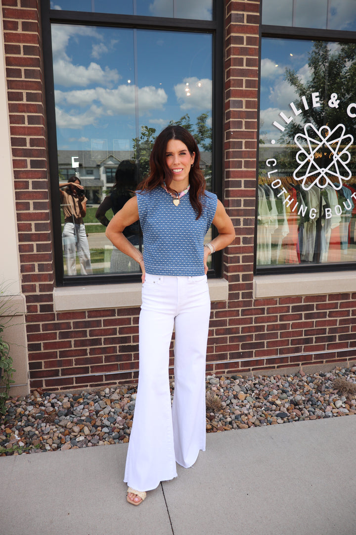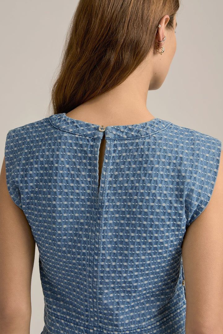 The Arlo Top redefines casual with thoughtful details that elevate a classic sleeveless denim shirt. Crafted from lightweight indigo jacquard, it offers breathability and subtle texture. Its round collar and wide hem create a relaxed silhouette, while side openings with button loop closures add adjustable comfort and style. A discreet peekaboo button at the back completes the design, making this top an effortlessly refined choice for laid-back sophistication.