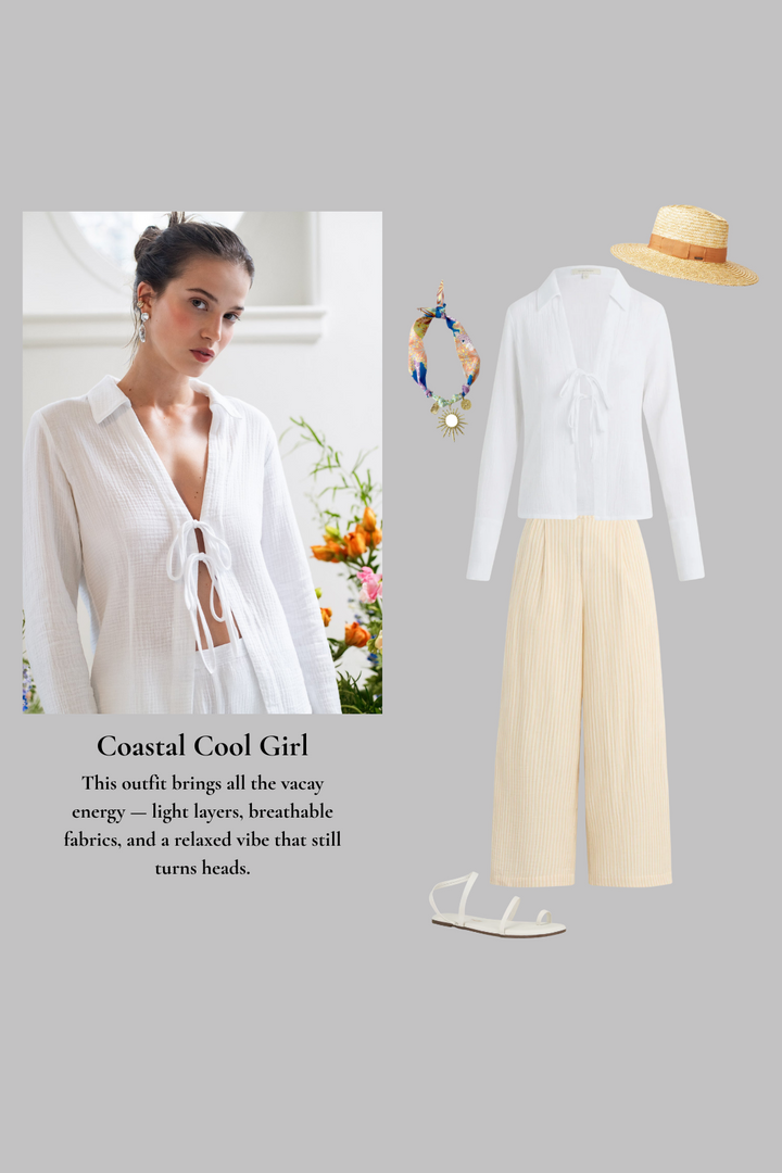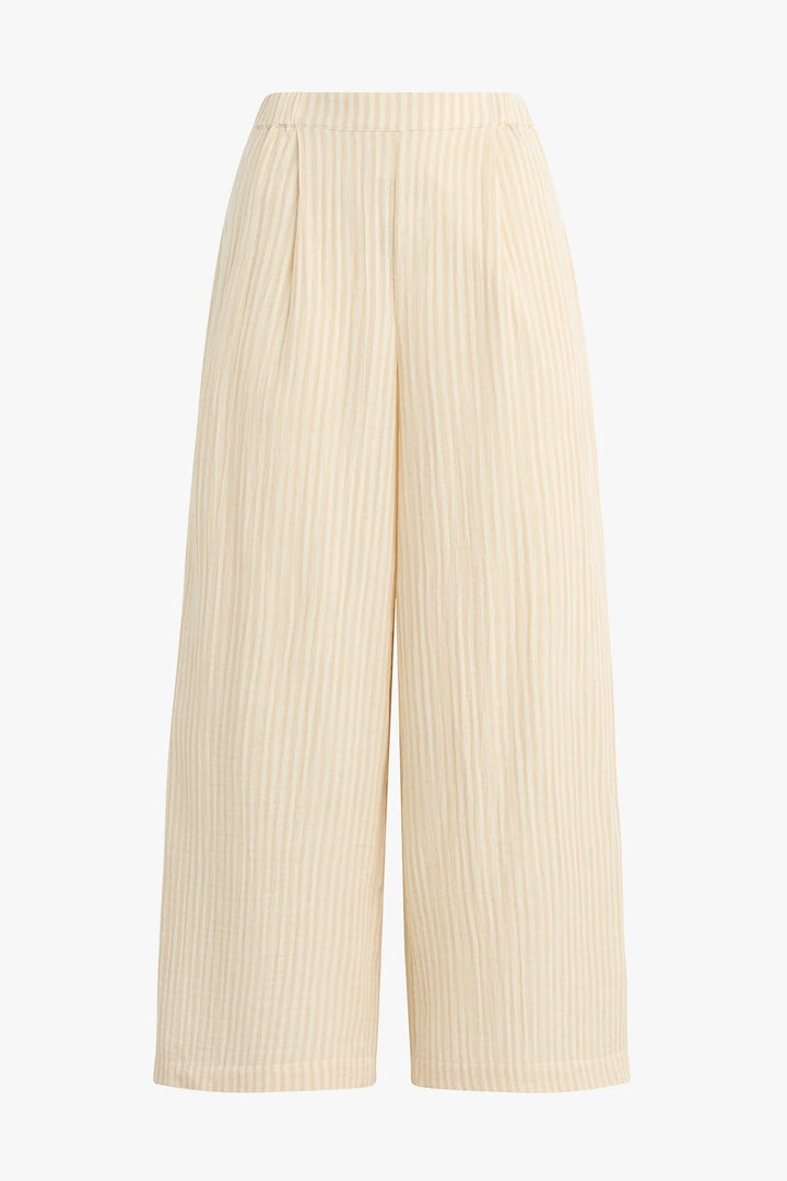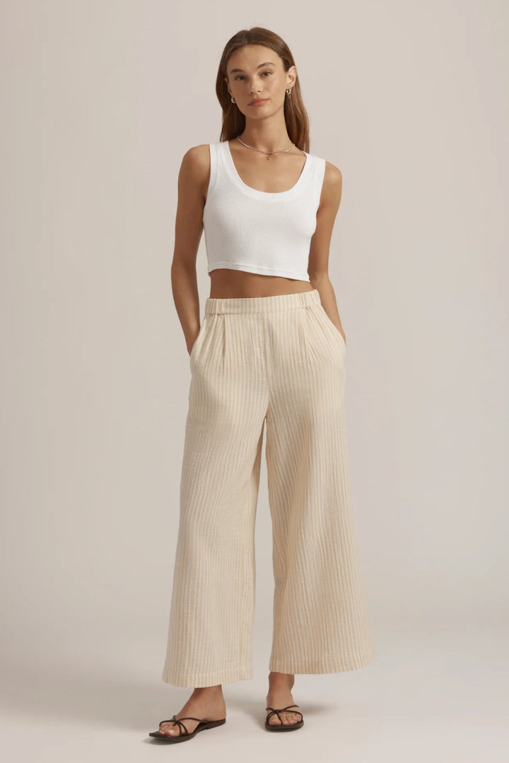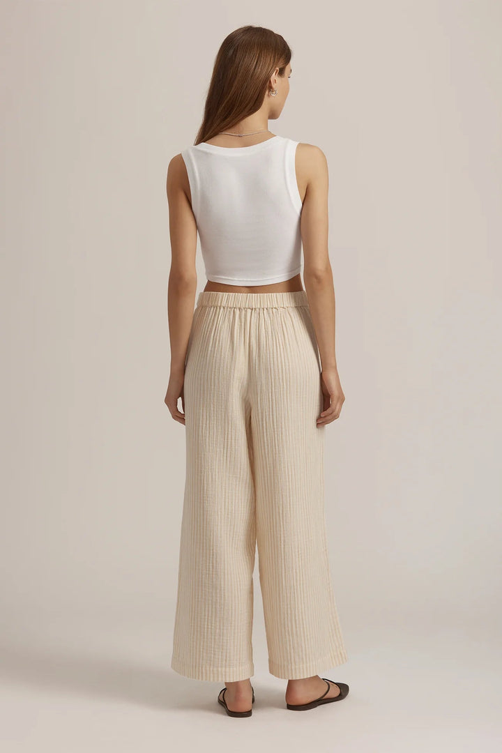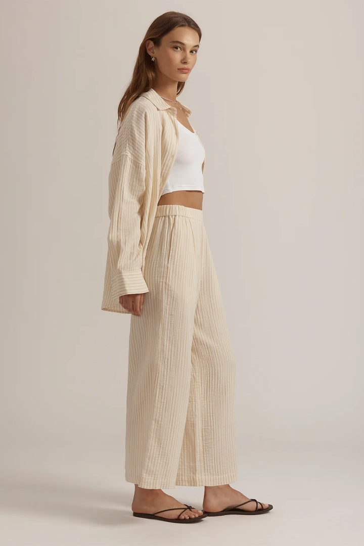 The Beach Walk Pant in Sand Stripe offers the perfect balance of comfort and style for coastal adventures. Crafted from airy lightweight gauze, these pants feature a flattering 12.75" rise and 26.5" inseam with a relaxed, wide-leg silhouette. Practical side pockets and a clean front waistband with discreet back elastic ensure both functionality and a polished appearance, making them an essential addition to your warm-weather wardrobe.