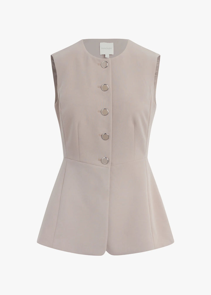 The Clocking In Top is a refined long-line vest designed for effortless sophistication. Crafted from a structured suiting blend, it features a crew neckline, exposed button detailing, and a fitted silhouette that flares subtly at the hem—creating a flattering, modern line. The soft taupe colorway pairs seamlessly with The Favorite Mini Short for a polished, editorial-ready look that bridges casual and tailored dressing.