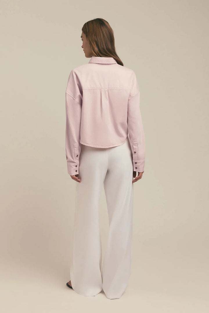 The Crop Ex-Boyfriend Shirt in Pale Pink is a fan favorite with its slightly cropped styling. Made from overdyed denim, this oversized button-up offers a relaxed fit and a pointed collar for a casual yet stylish look. Perfect for any occasion.