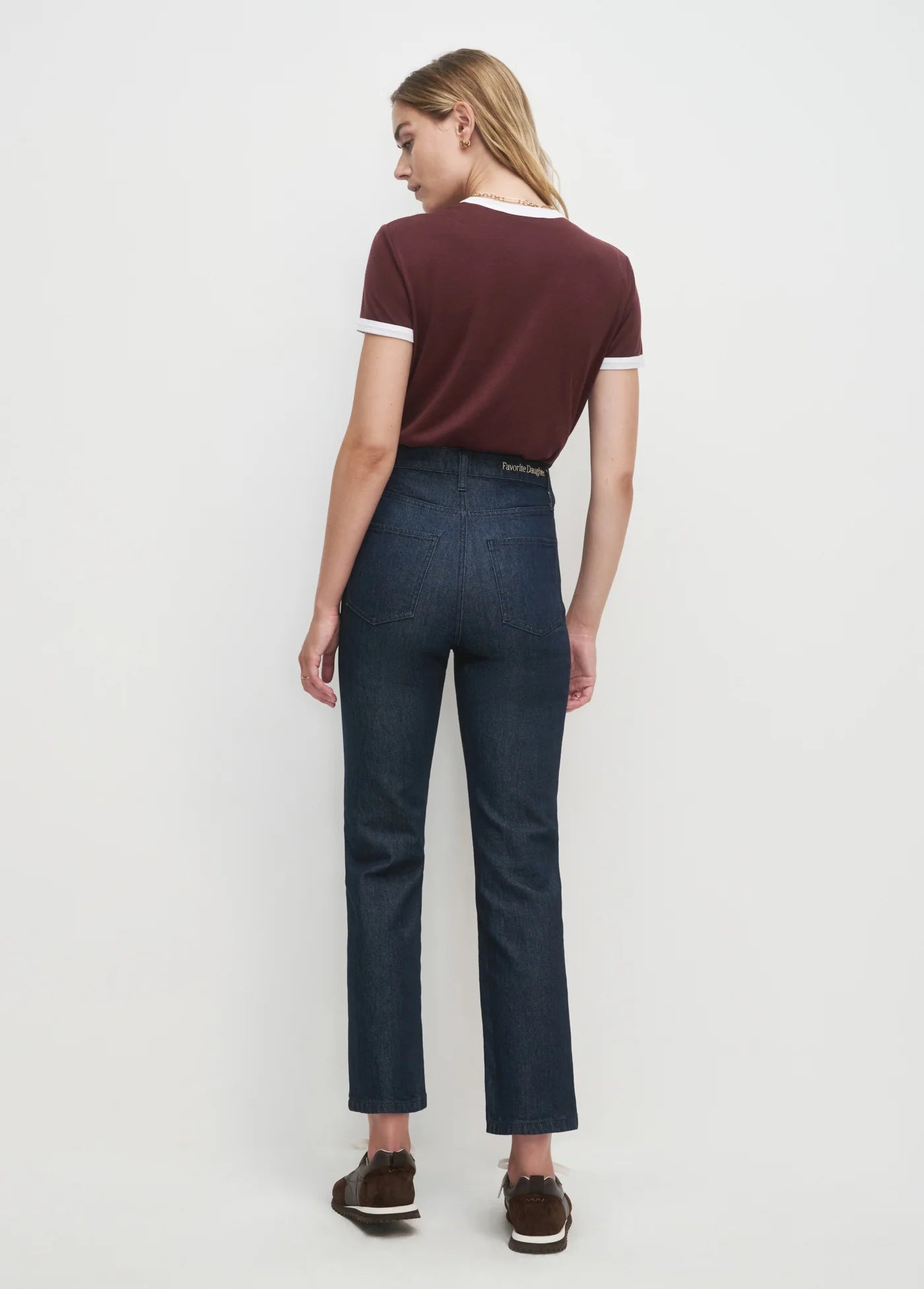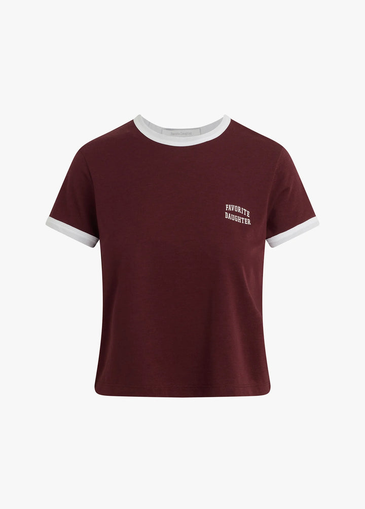 Throw it back with this cropped ringer tee that's equal parts nostalgia and everyday essential. Featuring the iconic Favorite Daughter logo front and center, it's cut with a fitted silhouette and finished with contrast trim at the neckline and sleeves for that classic '90s vibe. Perfect for layering or wearing solo—this burgundy and white combo is ready for rotation.