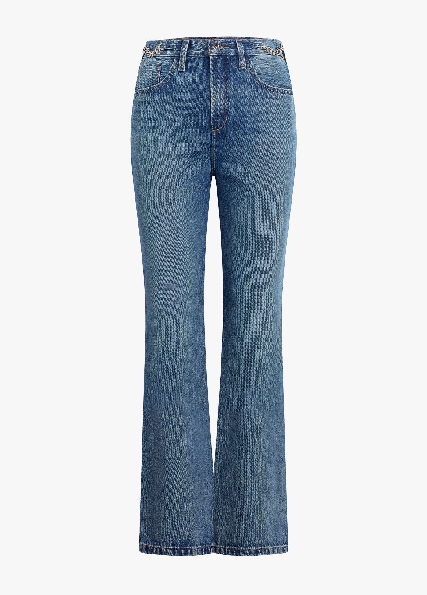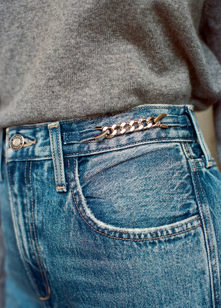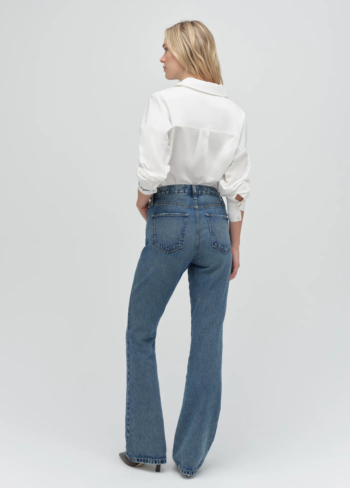 The Fancy Valentina Boot is your new denim obsession. With a flattering 10" rise and elongating 33" inseam, this vintage-inspired silhouette is designed to make your legs look impossibly long. Crafted from lightweight rigid Austin denim in a gorgeous medium blue wash, it only gets better with every wear—think perfectly broken-in vibes from day one. Gold chain trim sparkles along the side waistband, while whiskering and fading add authentic character. Topped off with our signature Favorite Daughter embroidery at the back, because details matter. Slip them on and feel the difference.