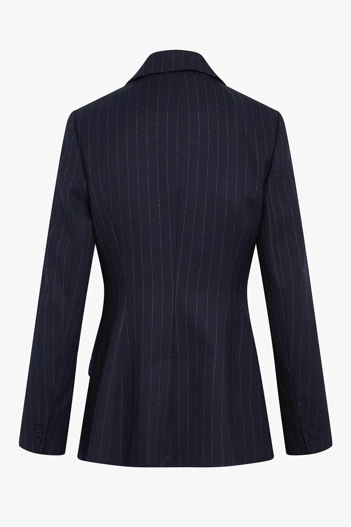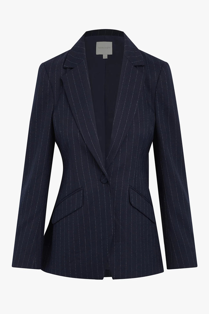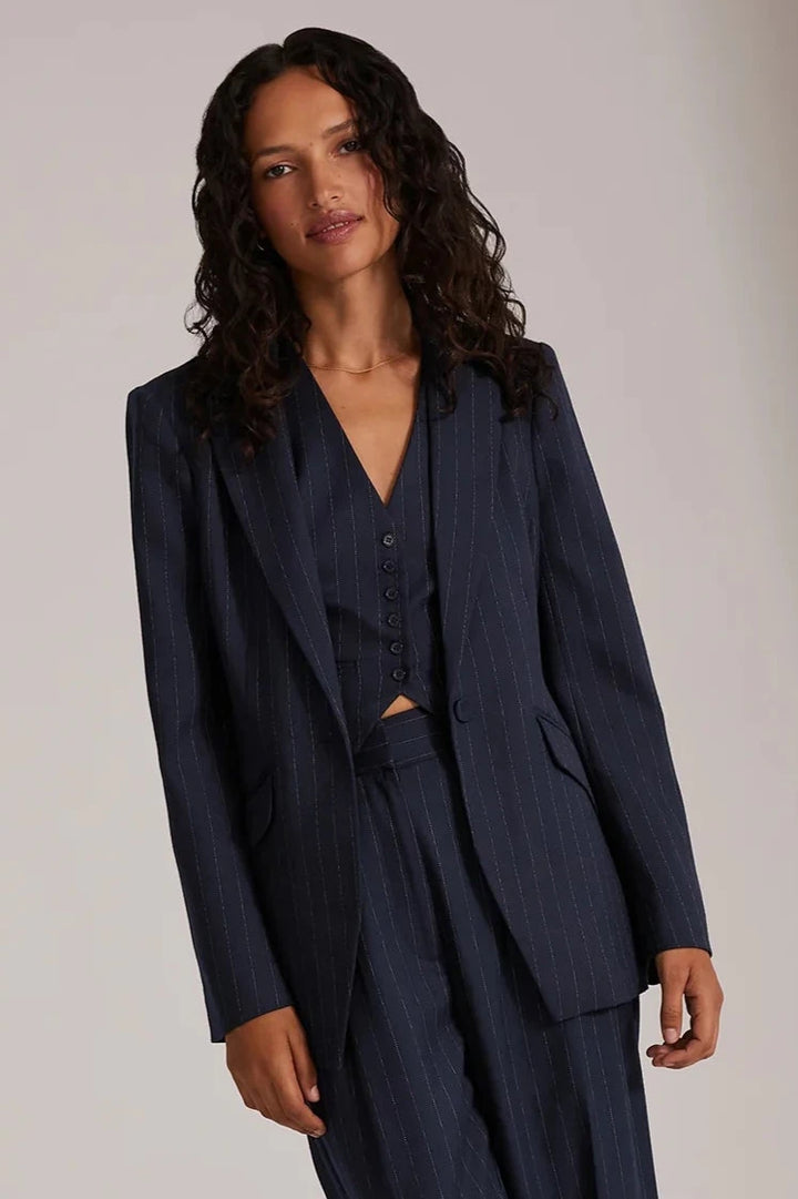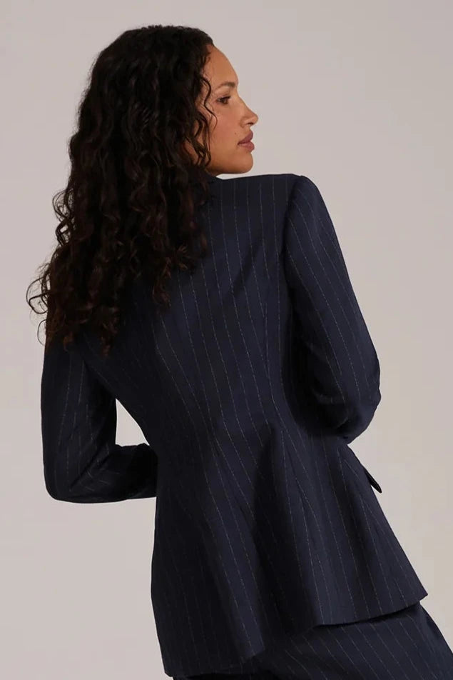 Introducing The Favorite Blazer! Crafted in navy pinstripe, this blazer is made from a blend of suiting fabric and features a contoured waist for a flattering silhouette. Perfect for adding shape and structure to any outfit. Versatile and stylish!