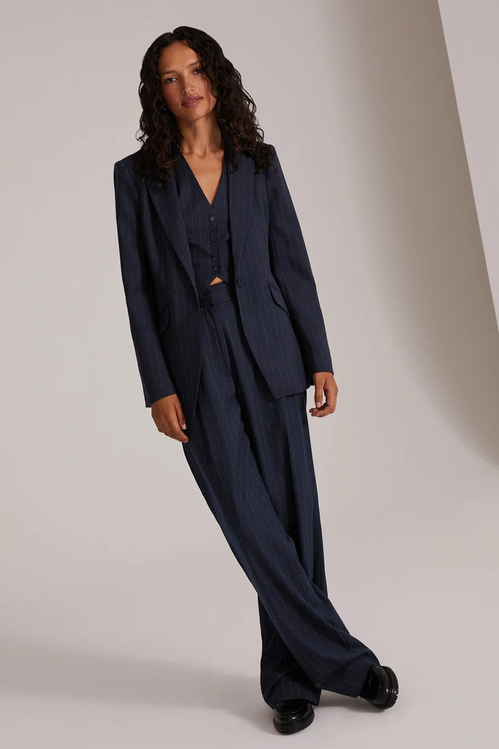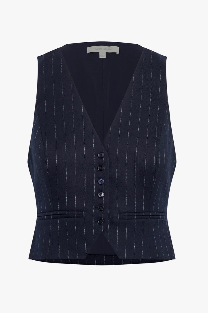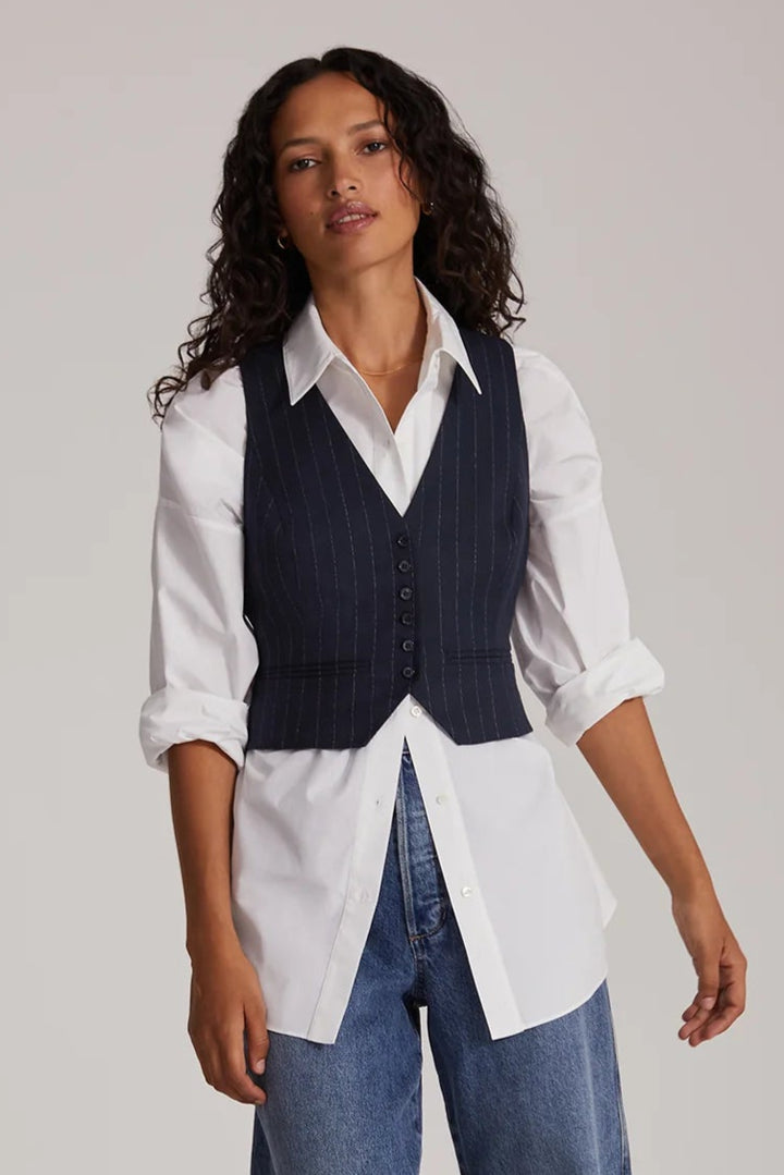 Elevate your style with The Favorite Vest in navy pinstripe. Its tailored slim fit, front button closures, and low v-neck exude minimalist menswear at its best. Made from blend suiting fabric and fully lined, this vest is a versatile and chic addition to any outfit. Pair with denim or complete the look with The Favorite Pant.