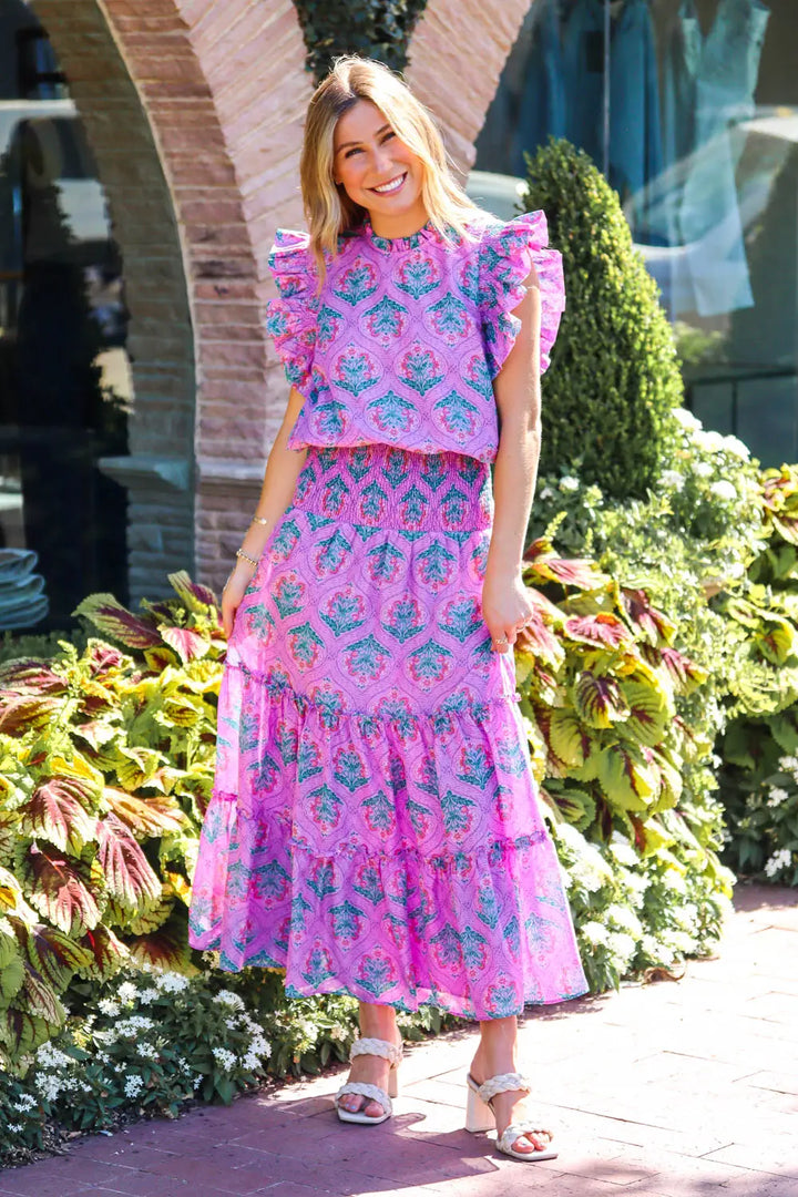 We love so many things about this convertible dress! Wide smocking across the top with a tiered skirt allows you to wear this as either a skirt or a dress. Silk blend top layer that is lined underneath. Pair with sandals, wedges or sneakers. You will stand out with the unique floral print on a bright purple background.