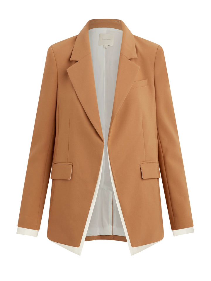 Elevate your style with the Kelly Blazer. Crisp white accents add sophistication to this open-front blazer, made from smooth stretch fabric for a comfortable fit. With front flap pockets and a hidden hook-and-eye closure, it's a modern take on menswear. (Hint: perfect for making a statement!)