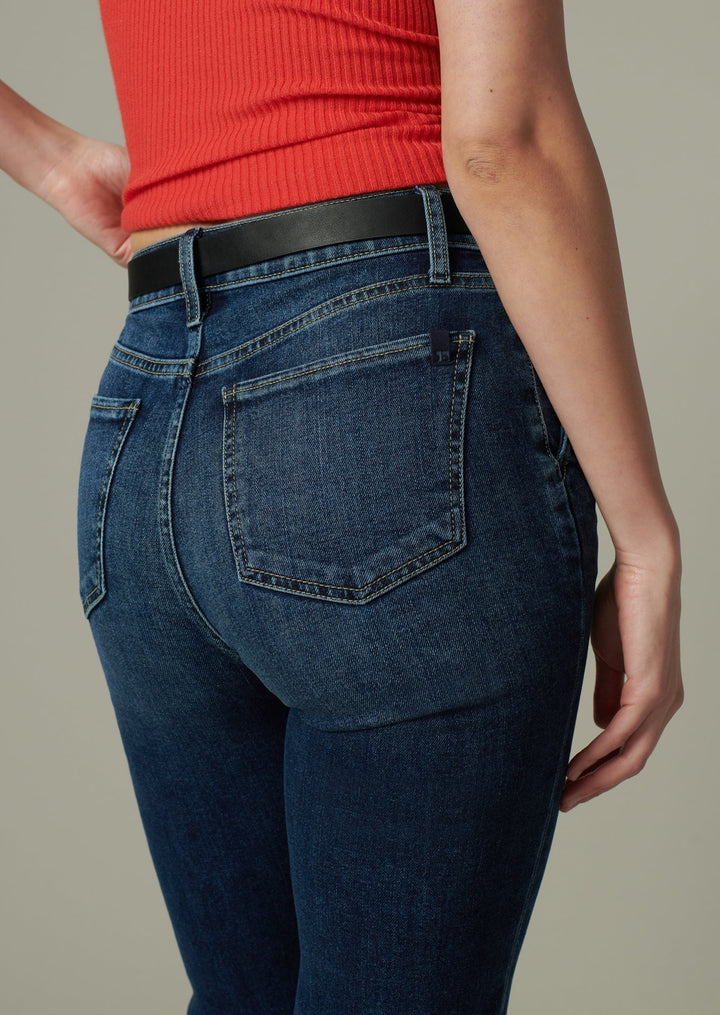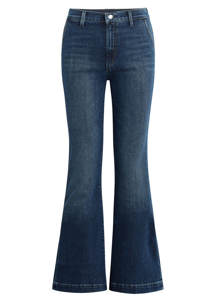 The Molly High-Rise Flare is fitted at the waist and kicked out at the wide hems, creating a curve-hugging ’70s-inspired silhouette. These forever flattering jeans feature comfort stretch denim in a classic dark-medium wash, Double Down, and are complete with slant front pockets, handsanding and top whiskering.