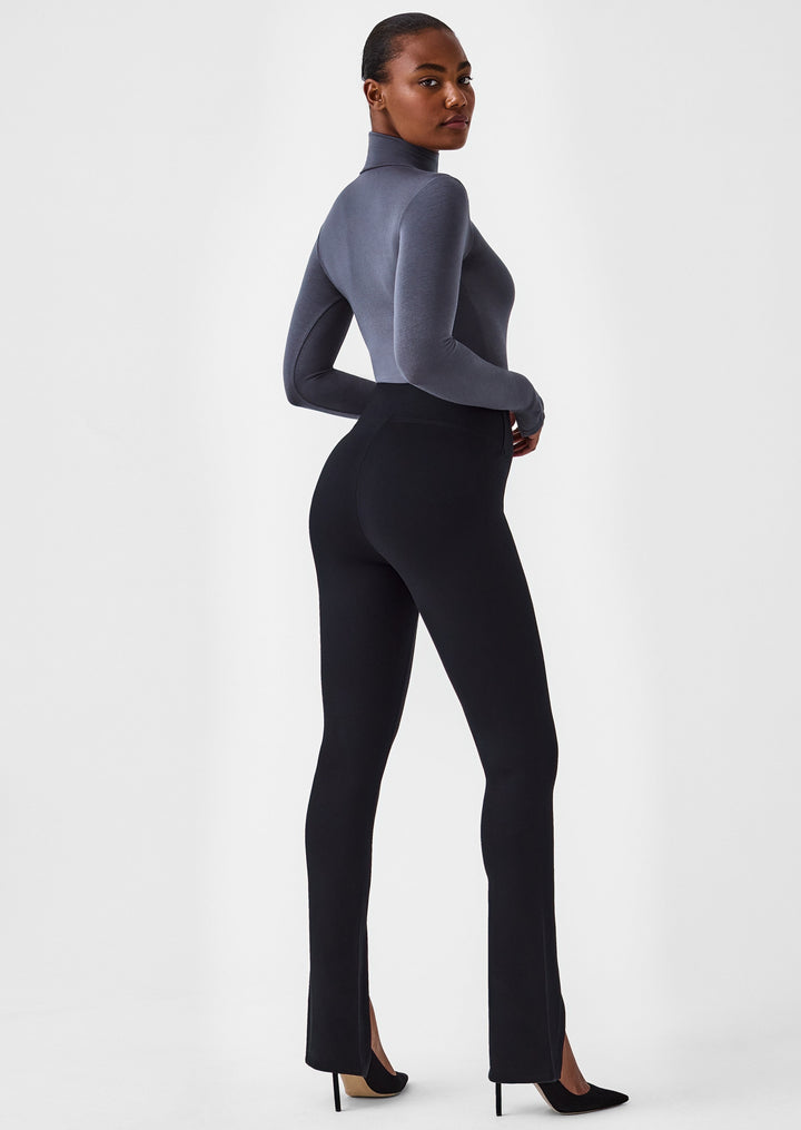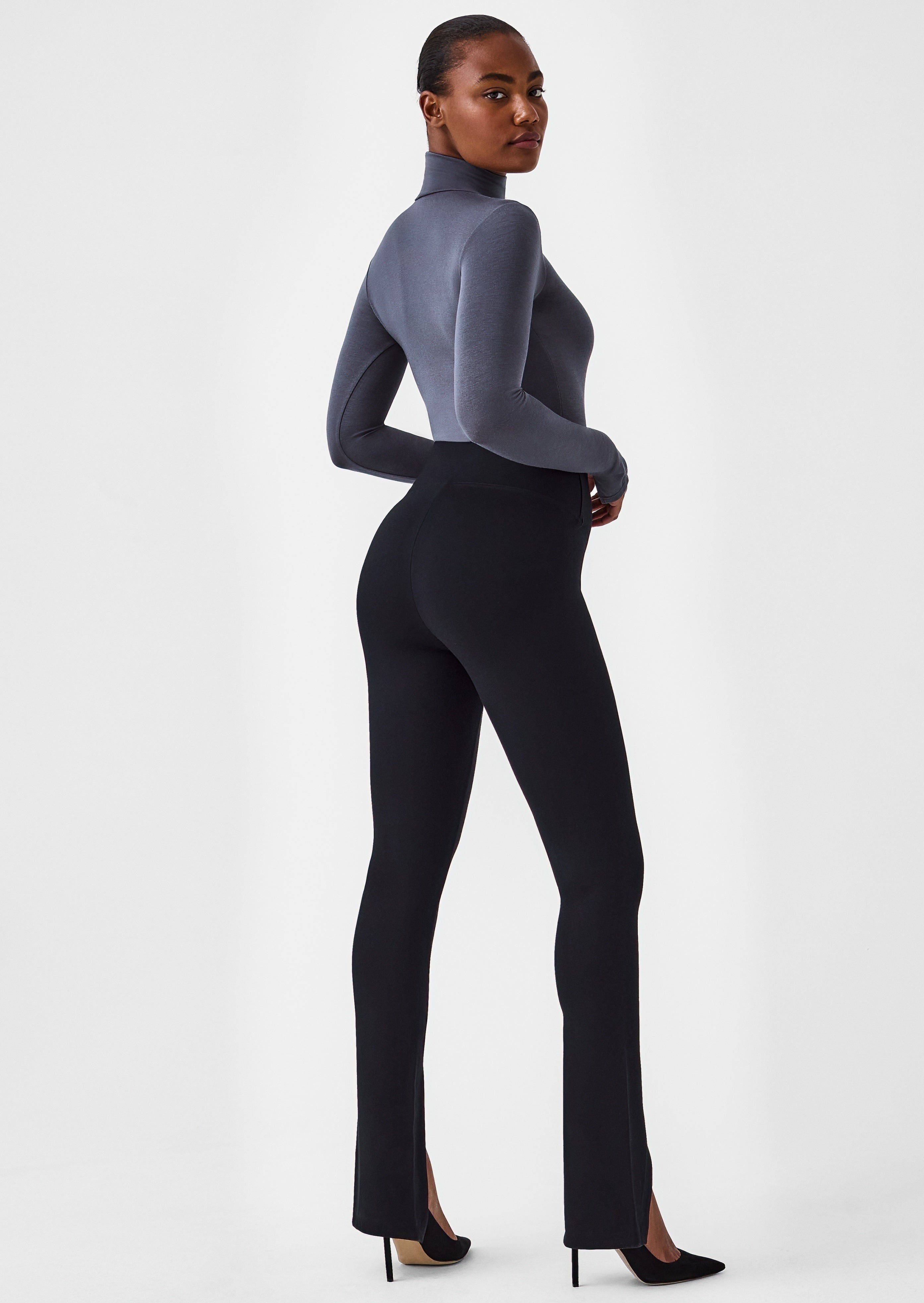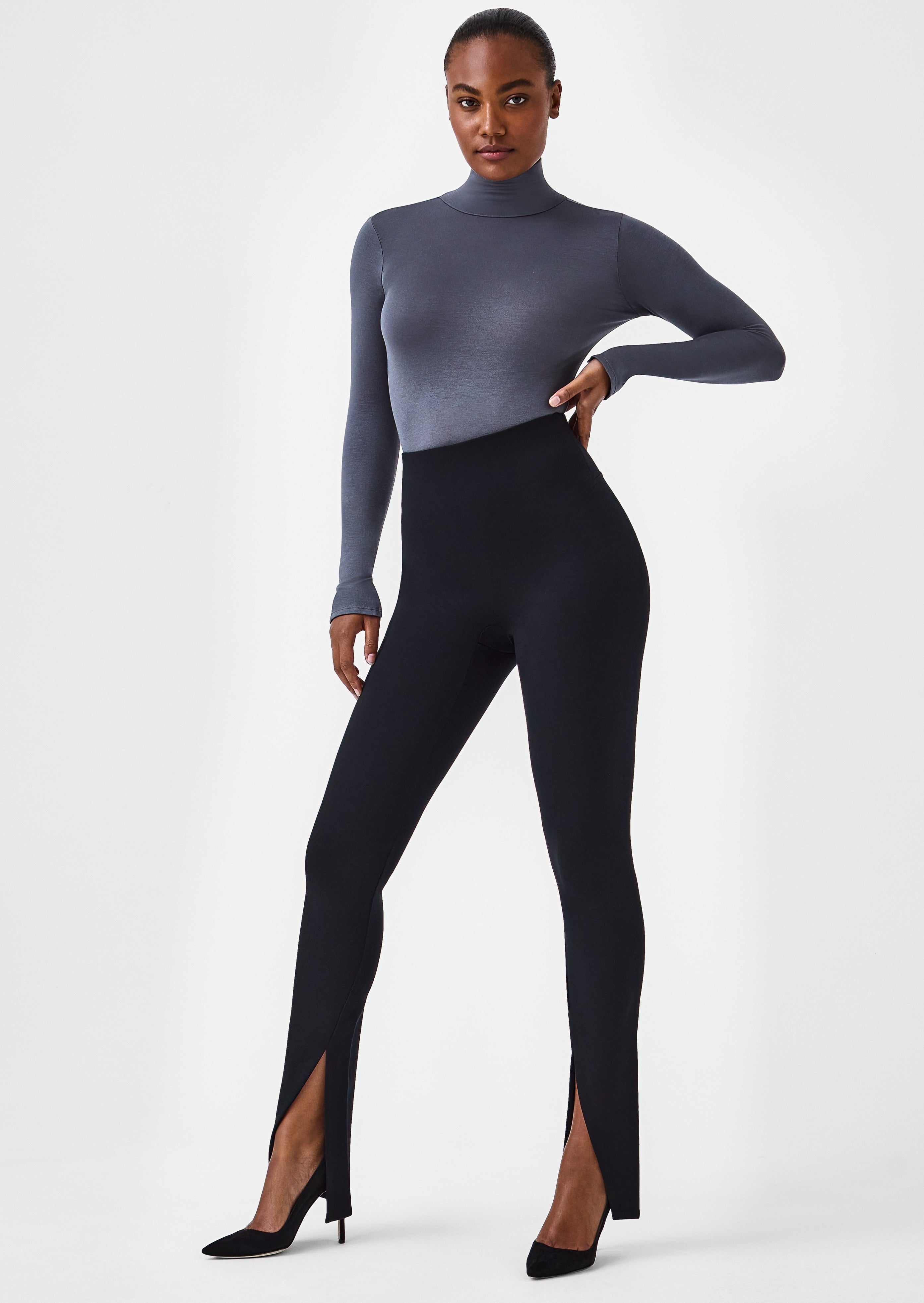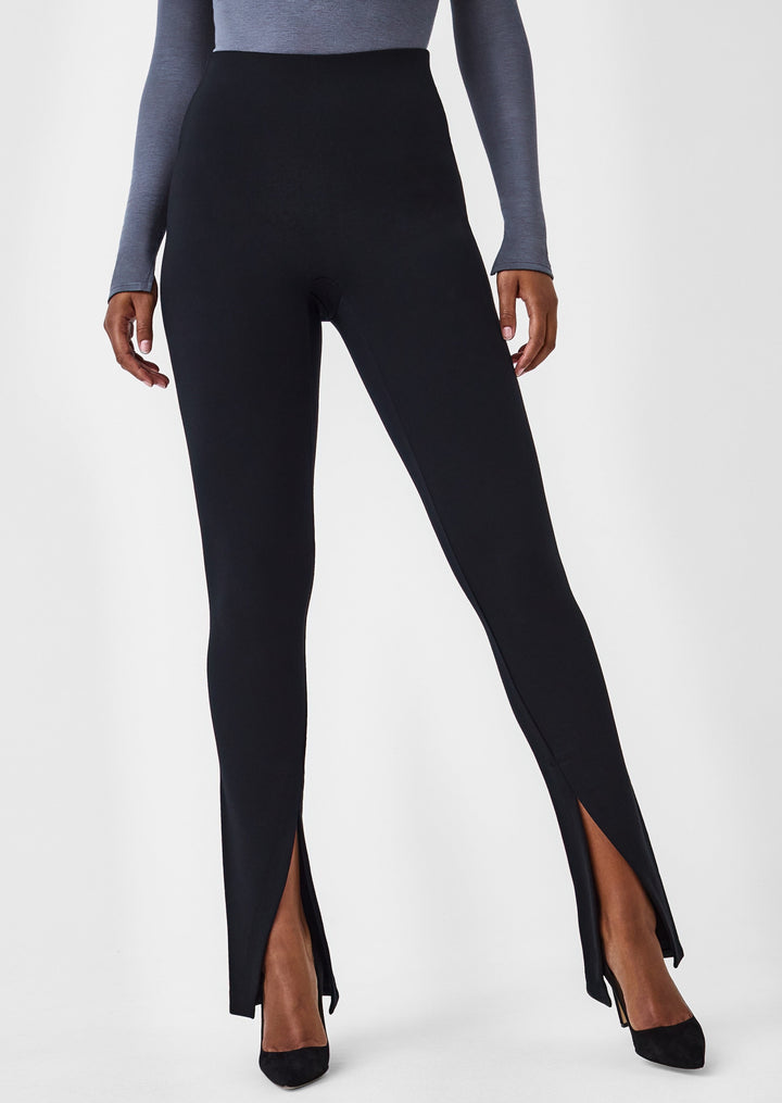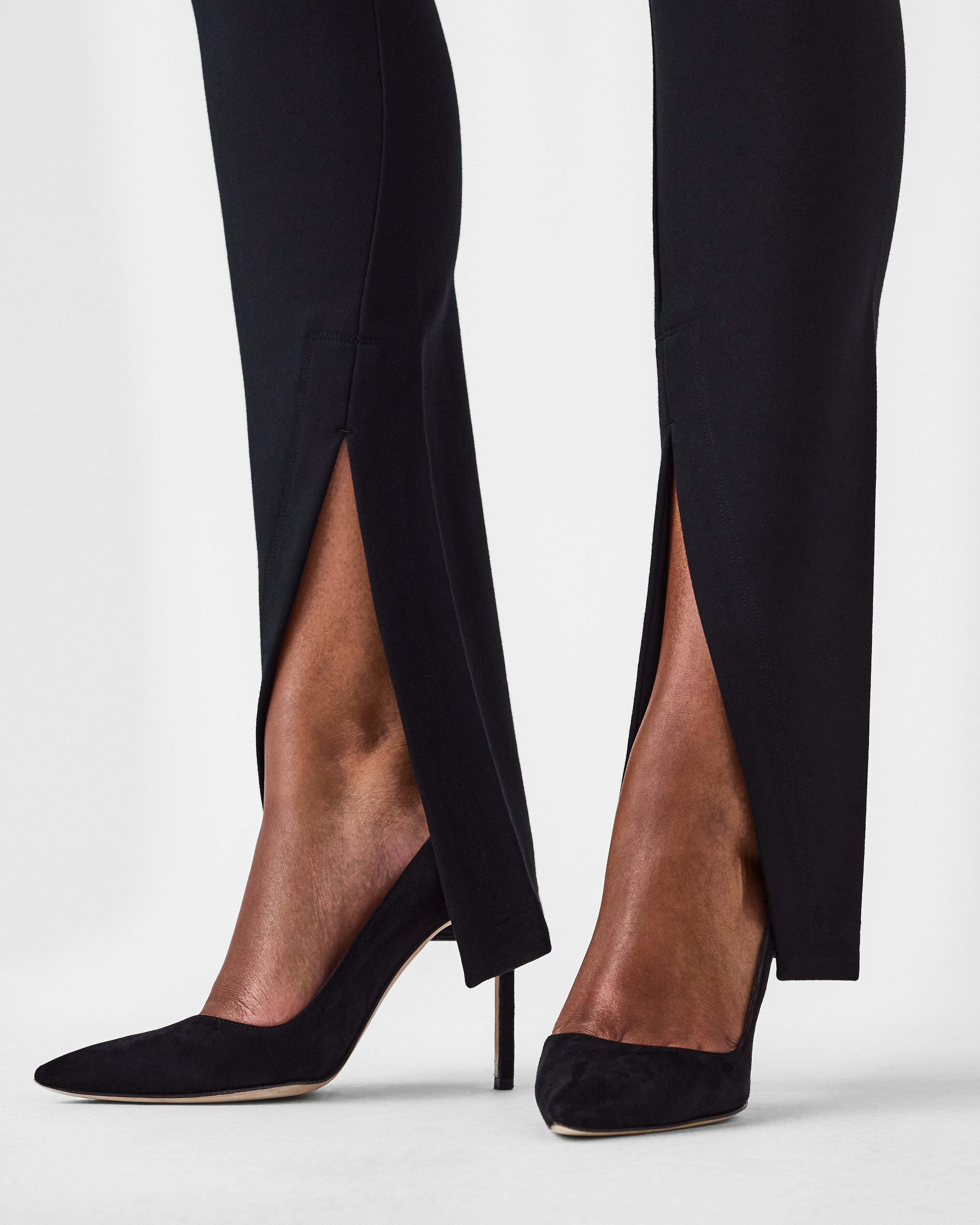 Effortlessly chic and comfortable, The Perfect Front Slit Legging in black pulls on with no zippers or buttons. The smoothing ponte fabric and hidden core shaping technology create a flattering silhouette. With front slit detailing, these versatile leggings can be dressed up with heels or down with flats.