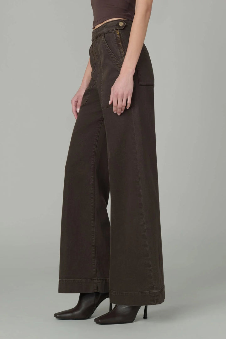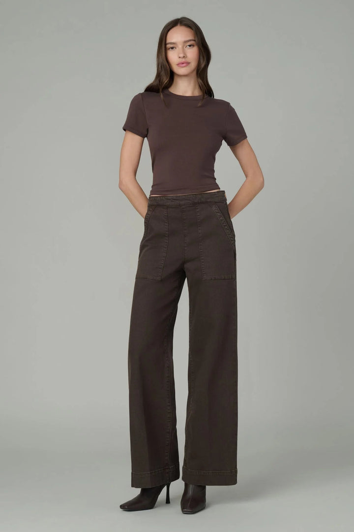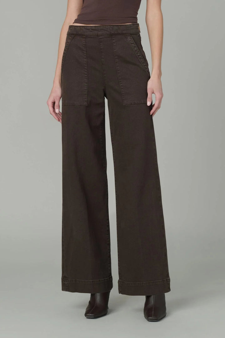 Step out in style with The Side Zip Wide Leg in Coffee Bean. Featuring a high-rise waist that hugs just right and flows into wide, relaxed legs, these pants balance comfort with a chic silhouette. The side zipper and button entry add a sleek twist, while patch pockets offer playful practicality. Perfect to mix and match, they bring effortless flair to any outfit.