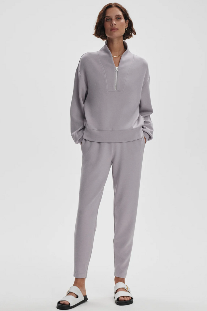 The Slim Pant 27.5- Raindrops is the epitome of comfort and style. Crafted from Varleys innovative DoubleSoft® fabric, these sweatpants offer a slim cut for a flattering fit. The ribbed waistband provides both security and comfort, while the tapered leg design adds a modern touch to this classic loungewear staple. Experience ultimate relaxation in these expertly made sweatpants.