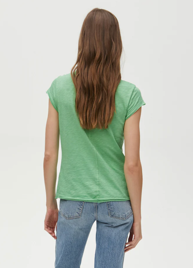 Easy fit classic crewneck tee with subtle elevated details throughout. Featuring exposed seam neck and hemlines, a back center seam and short cap sleeves. Pair with all shades of denim.