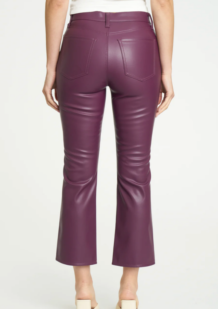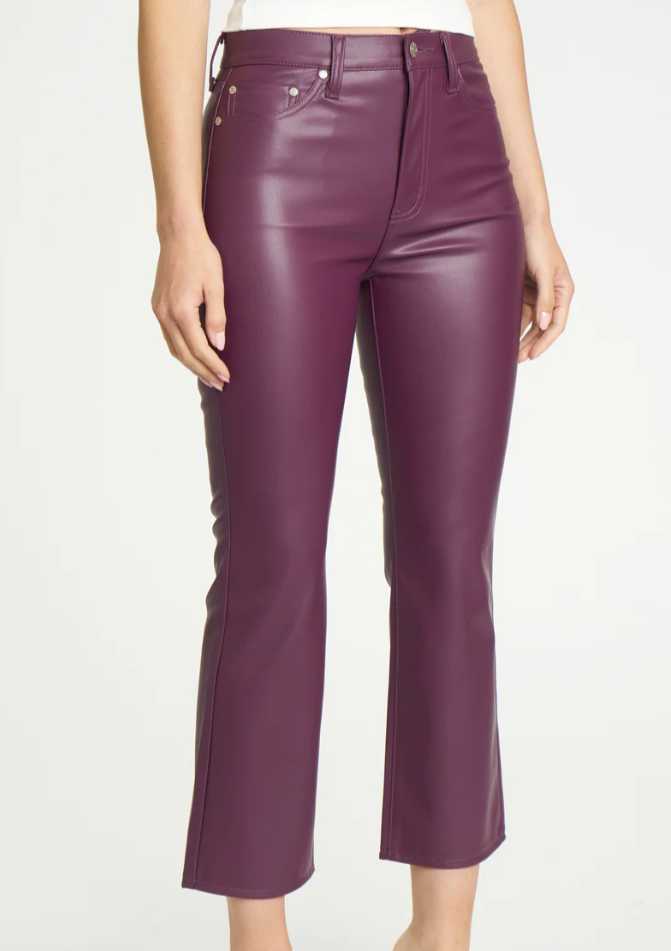 The Shy Girl- Coated Jam offers a daring, unique style for any holiday wardrobe. Show off your look in this high rise kick flare jean with an eye-catching deep plum hue and luxe faux leather finish. Perfect for any occasion!