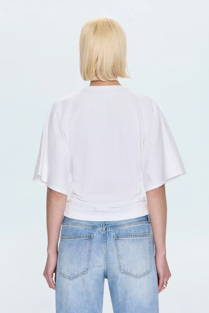 The Veronica Top in Le Blanc is your new go-to for effortless style. Its relaxed dolman sleeves and drop shoulders flow into a sleek, side-cinched fit that flatters every curve. Made from soft, 100% cotton compact jersey, it feels like a gentle hug all day long. The crisp white shade adds a fresh, playful touch, perfect for layering or shining solo. With a shirttail hem that moves with you, this top brings comfort and chic together in one irresistible package.