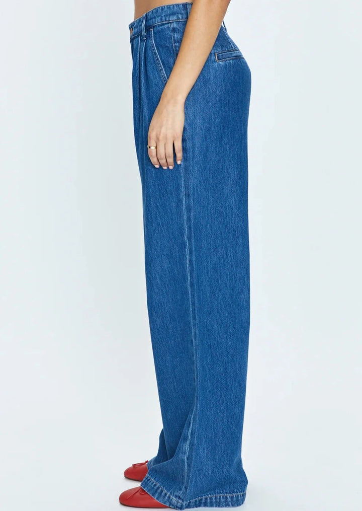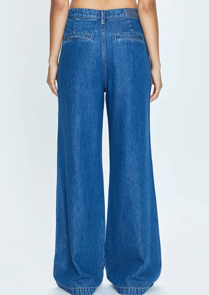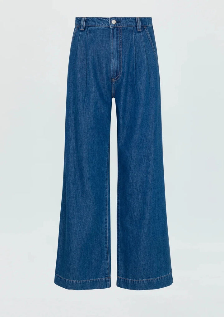 The best of both worlds. Lightweight non-stretch denim feels like your favorite pair of jeans, reimagined into a high rise, wide leg trouser silhouette with a relaxed fit that's effortlessly cool and elevated. Midnight Sun is a saturated indigo denim wash with wide seaming and clean finishes, with trouser inspired rear welt pockets.