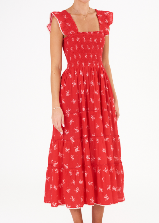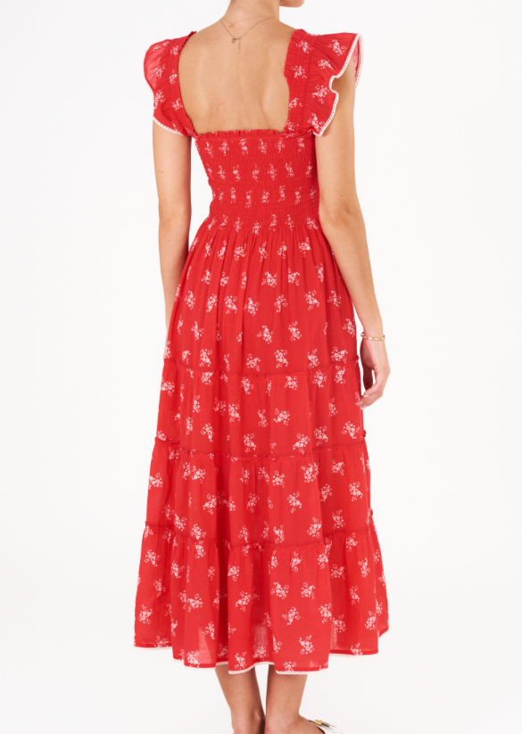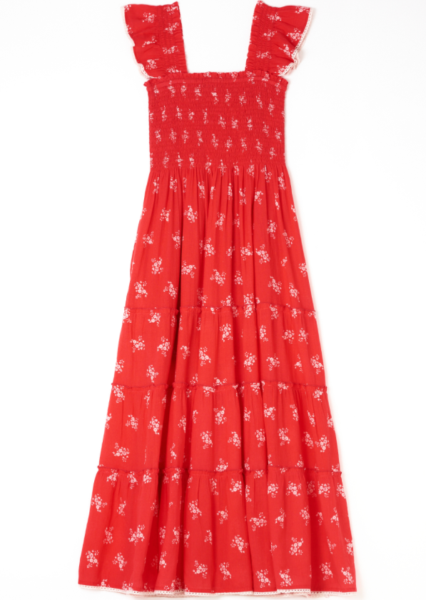 Introducing our Vivi Print Maxi Dress in vibrant red! This dress is perfect for your Spring/Summer wardrobe with its bold hue and feminine details. The wide frill shoulder straps add a touch of romance while the white floral print brings a playful charm. The tiered maxi skirt adds a flowy and flattering silhouette, and the elasticated bodice ensures a comfortable fit. Be bold and beautiful in our Vivi Print Maxi Dress! Also available in green