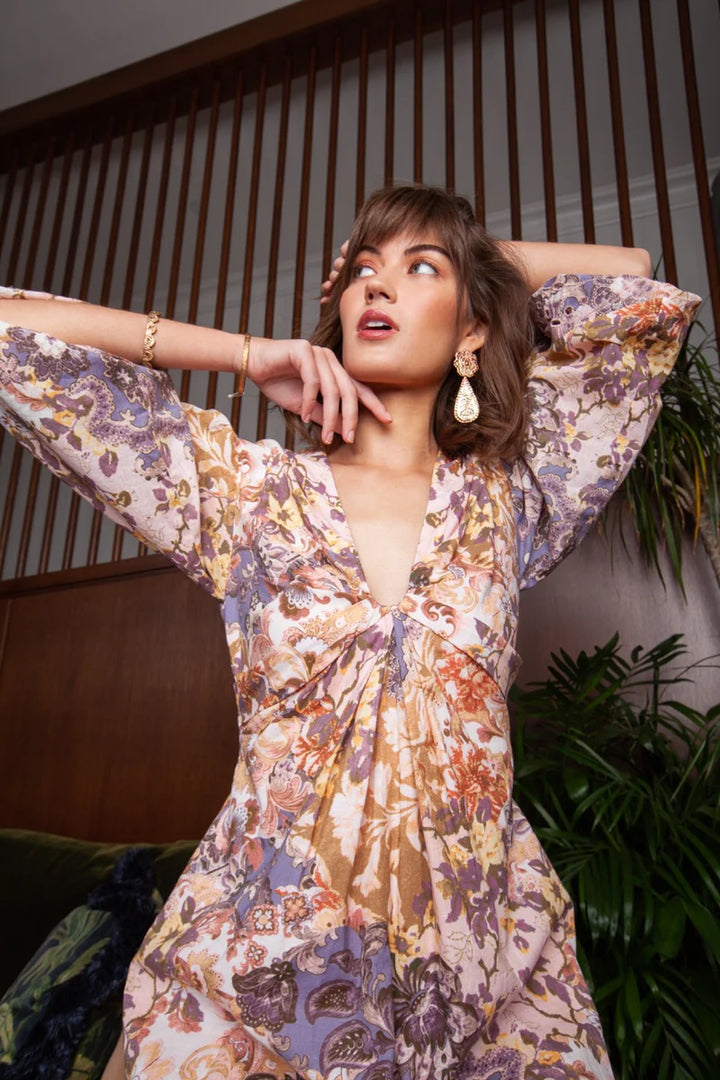 Look and feel your absolute best in the Weatherly Dress in the August Bloom print. This elegant piece features a v neckline, ruching along the chest, and embroidered billow 3/4 length sleeves, all crafted with a cotton blend for ultimate comfort and style. With it's mini length, you can dress it up for special occasions or dress it down for weekend brunch. Make a statement wherever you go with the Weatherly Dress!