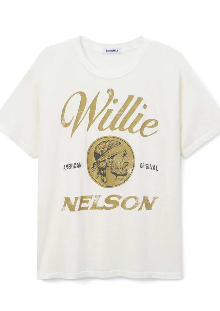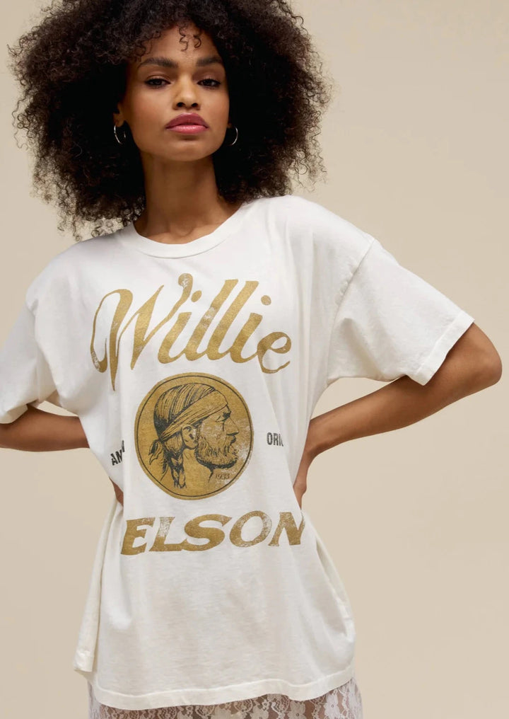 Get ready to rock and roll with the Willie Nelson American Original Merch Tee! This perfect-fit oversized graphic tee features an ivory background and metallic gold ink for some extra flair. A must-have for any Willie Nelson fan, this vintage white tee is the perfect addition to your concert attire. (Yeehaw, it's time to ride that country wave!)
