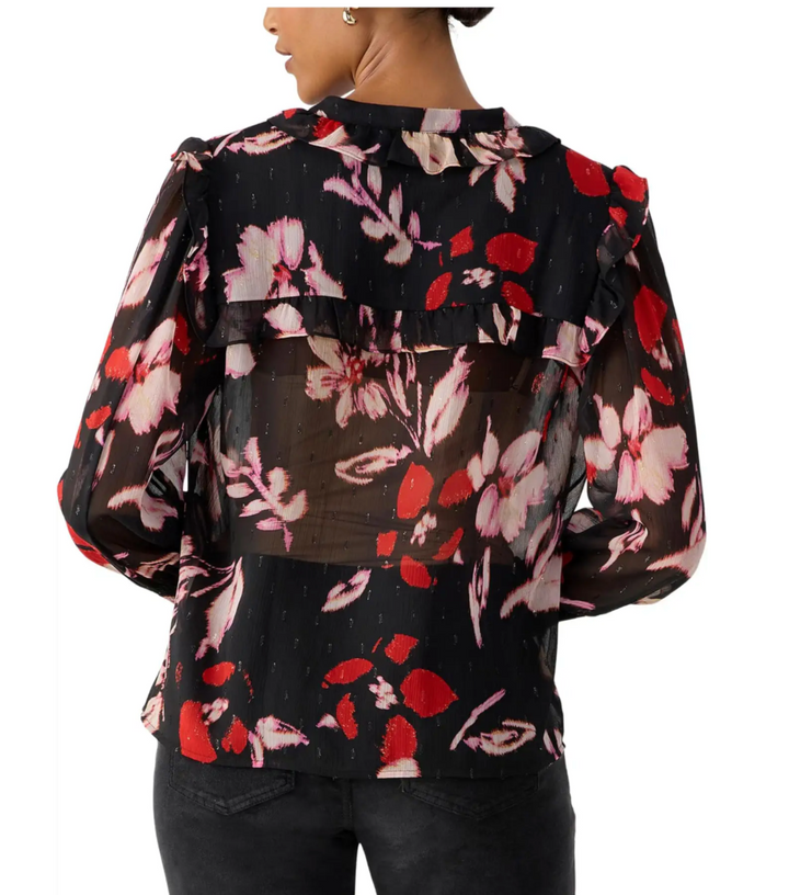 Introducing our Winter Wish Blouse in Poinsettia print! This sheer black blouse features a bold red and pink floral print with a touch of metallic for a festive touch. The button down front and ruffle detailing make it perfect for the holidays and beyond, while the smocked wrists add a charming detail. Make a statement and spread cheer with this must-have blouse.